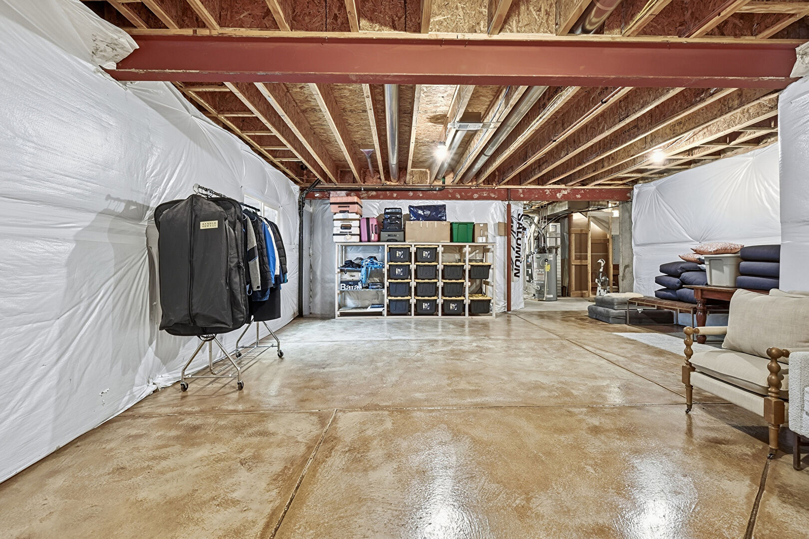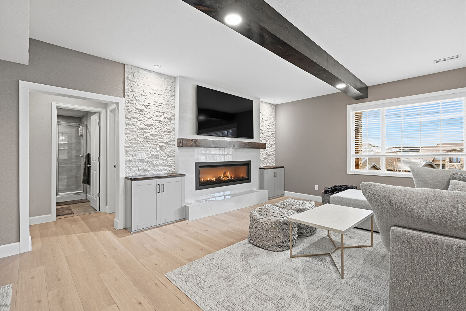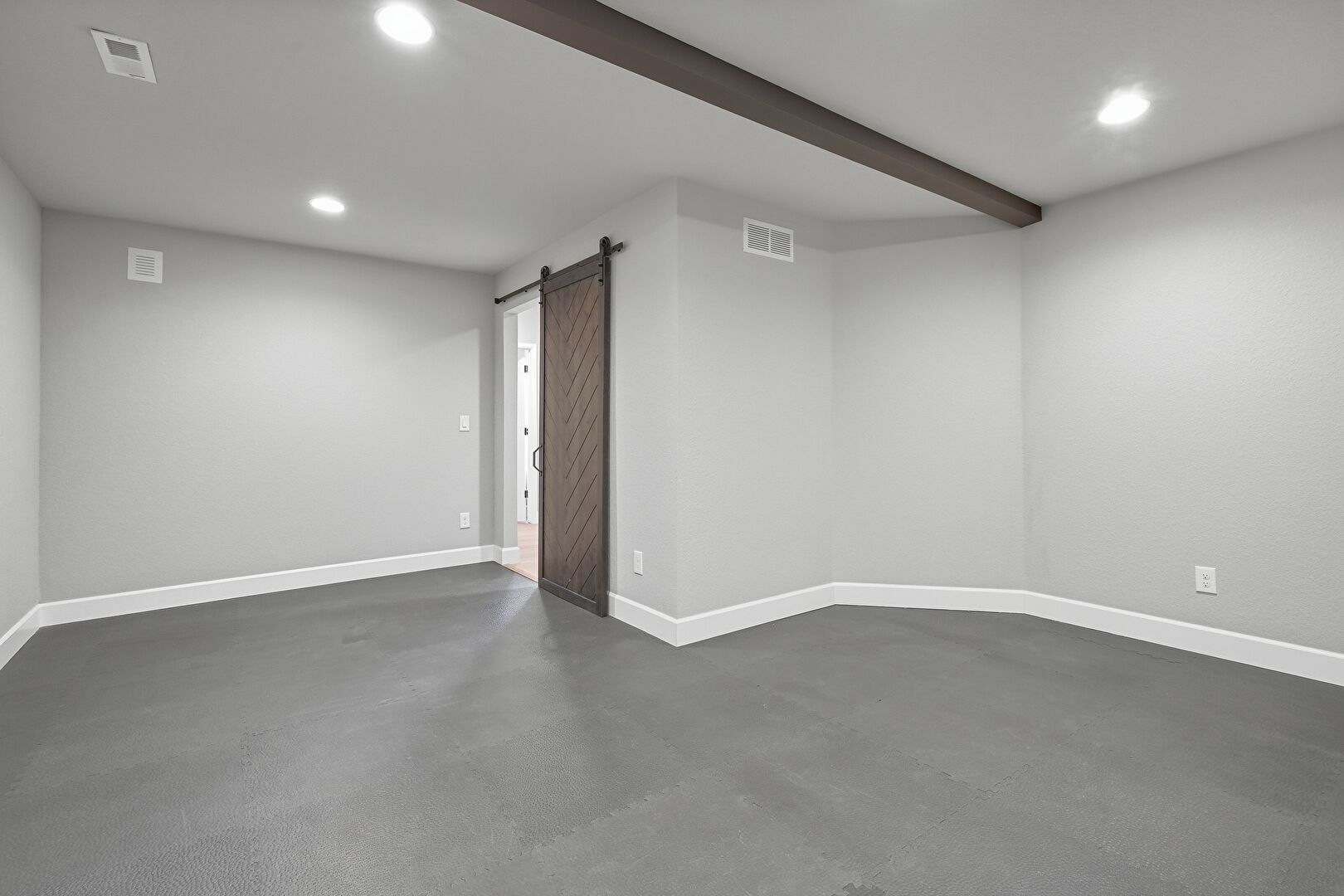Barn Door, Baseboards Wall, Beamed Ceiling, Concrete Floor, Drywall, Recessed Lighting, Vent, Recessed Lighting, Vent