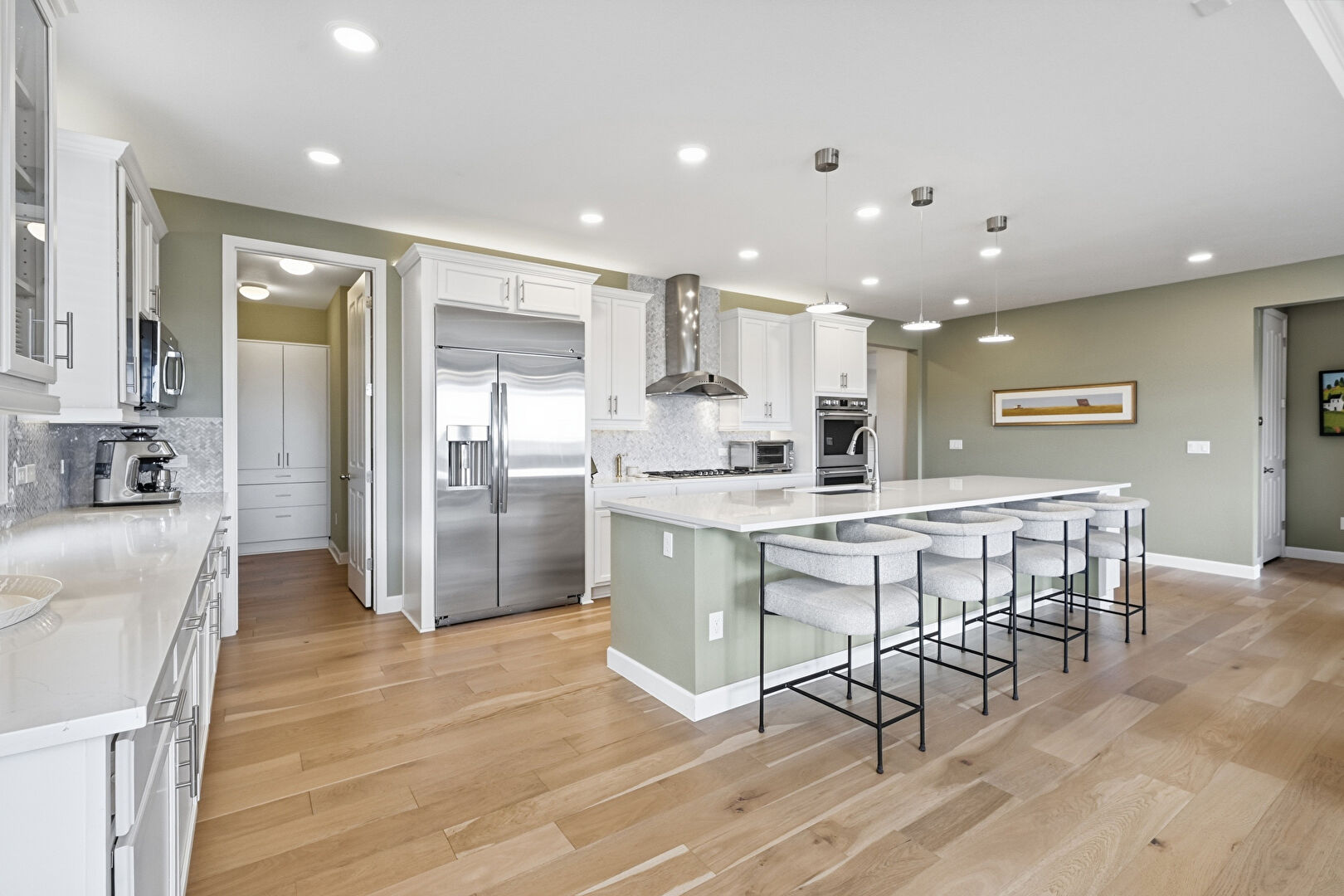 Baseboards Wall, Ceiling Fan, Crown Molding, Crown Molding Cabinets, Double Oven, Drywall, Fireplace, Glass Insert Cabinets, Kitchen Bar, Kitchen Island, L Shaped Kitchen, Natural Light, One Wall Kitchen, Opens To Living Area, Pendant Lighting, Pot Filler, Recessed Lighting, Shaker Cabinets, Stone Countertops, Toaster, Vent, Wood Finish Floor, Drywall, L Shaped Kitchen, Recessed Lighting, Toaster, Wood Finish Floor