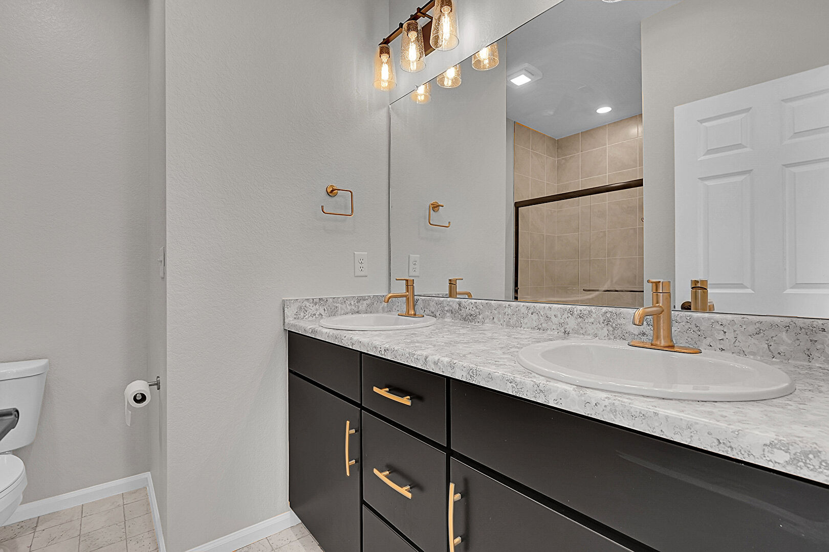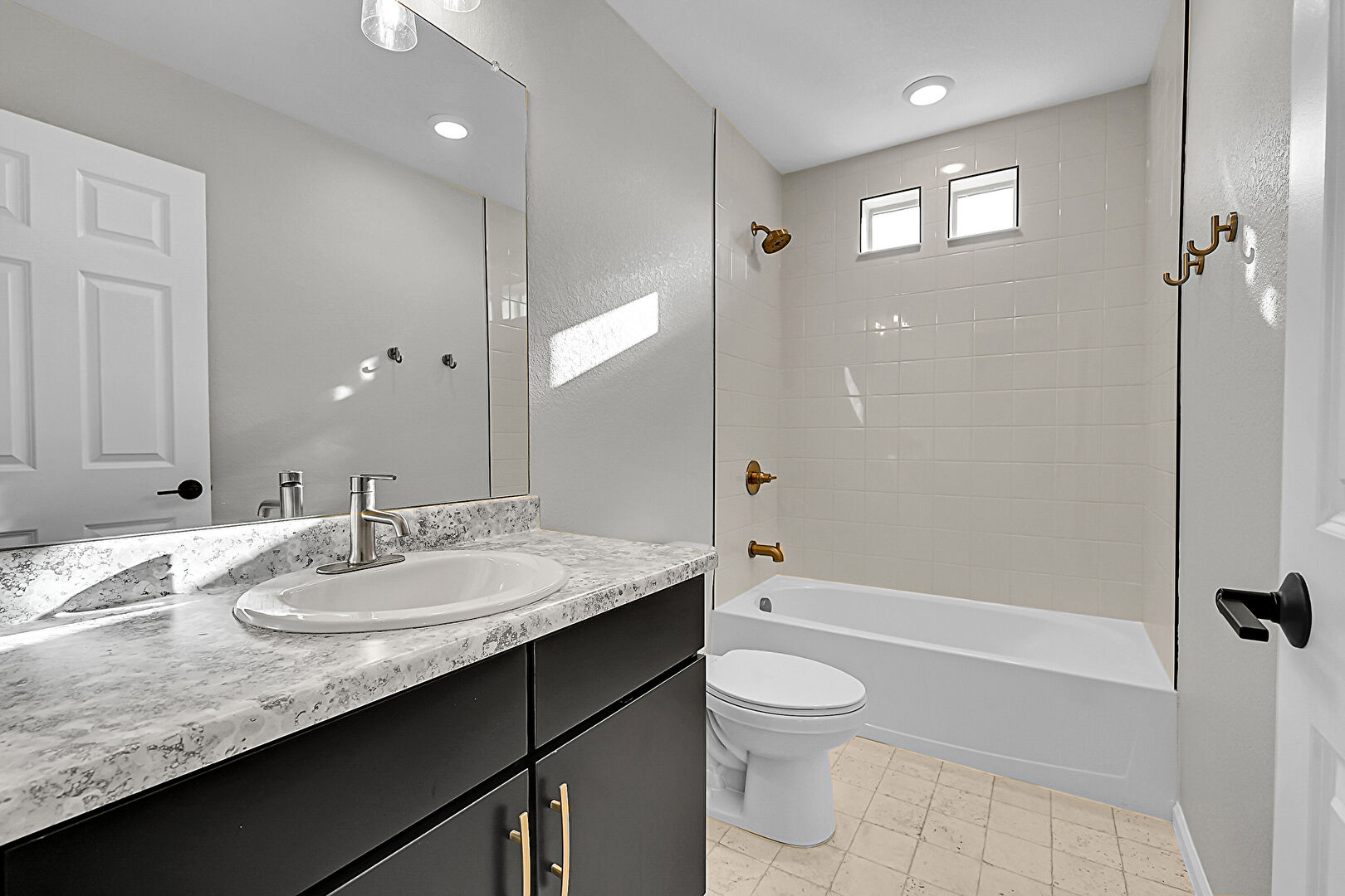 Baseboards Wall, Combined Bath Shower, Drywall, Full Bathroom, Natural Light, Recessed Lighting, Vinyl Floor, Vanity