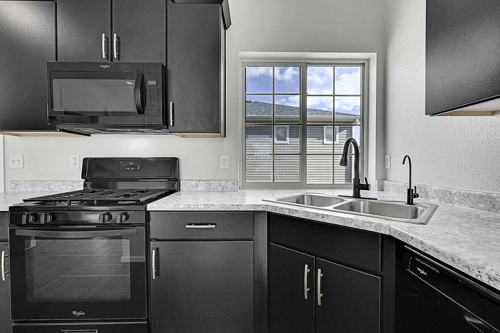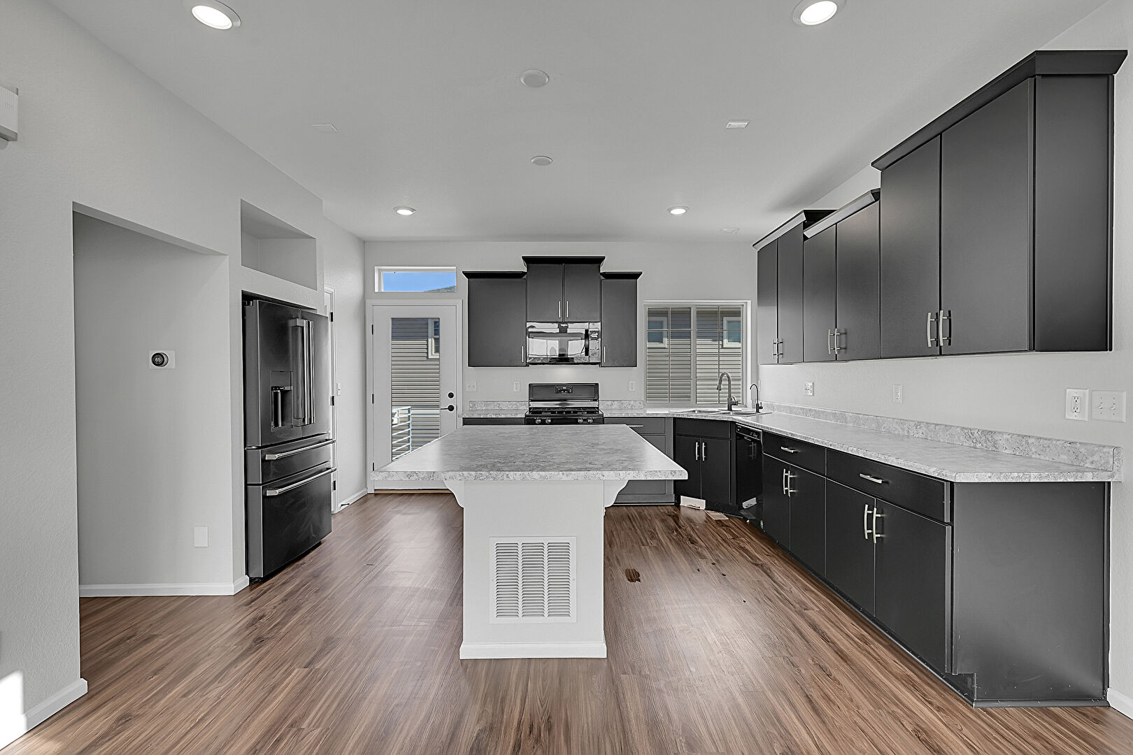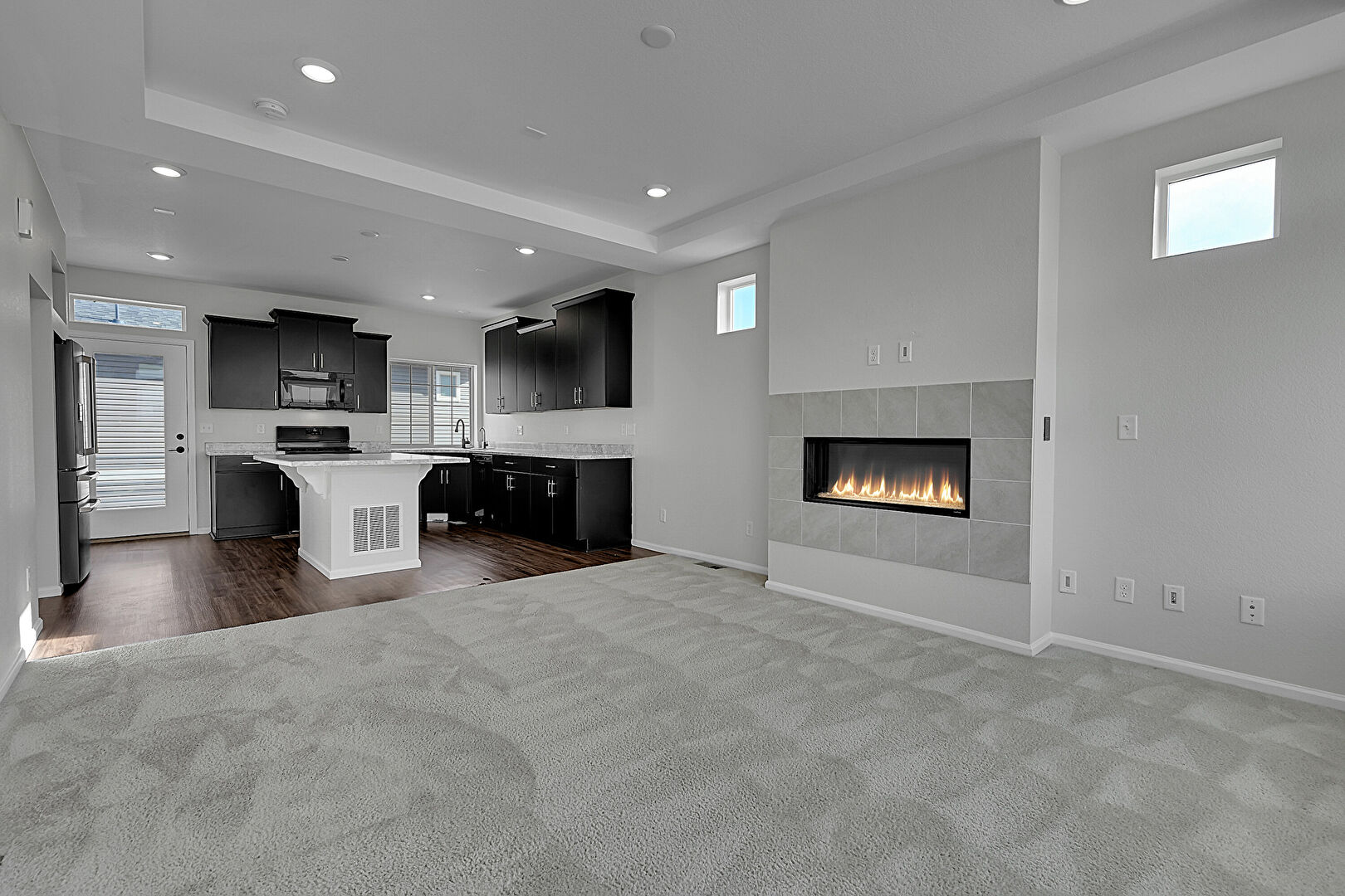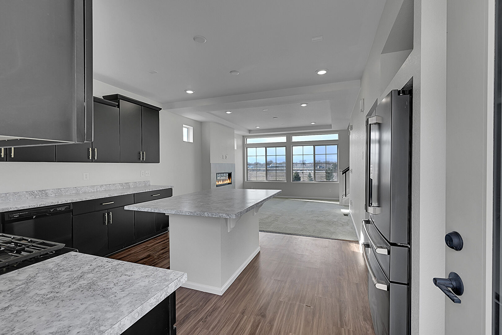 Baseboards Wall, Black Cabinets, Carpet, Crown Molding Cabinets, Drywall, Fireplace, Kitchen Bar, Kitchen Island, Natural Light, Open Shelves, Opens To Living Area, Recessed Lighting, U Shaped Kitchen, Vent, Wood Finish Floor, Fireplace, Kitchen Bar, Kitchen Island, Natural Light, Textured Wall