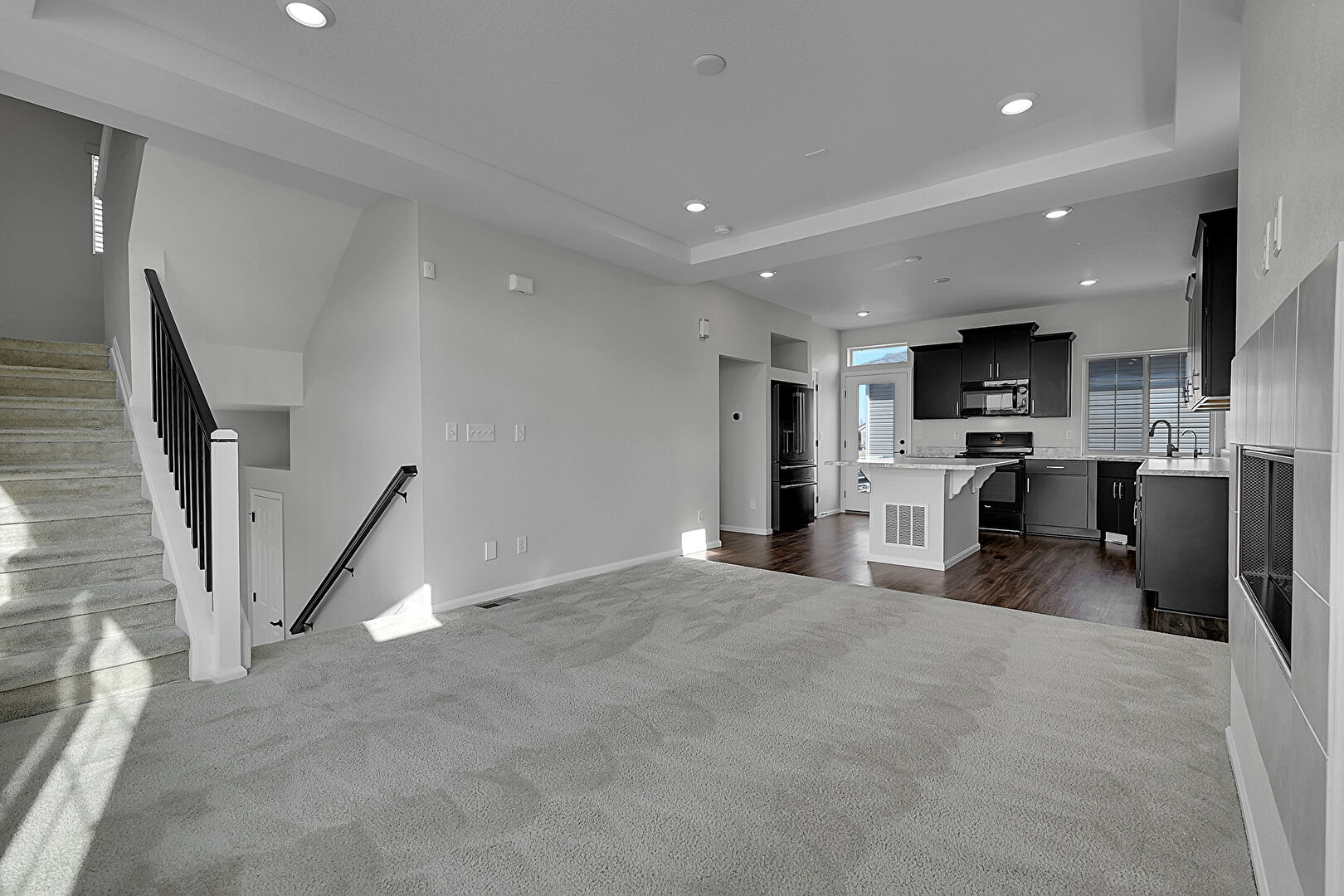 Baseboards Wall, Carpet, Drywall, Fireplace, L Shaped Kitchen, Natural Light, Recessed Lighting, Smoke Carbon Monoxide Detector, Stairs, Textured Wall, Tray Ceiling, Vent, Wood Finish Floor, Recessed Lighting, Tray Ceiling, Vent