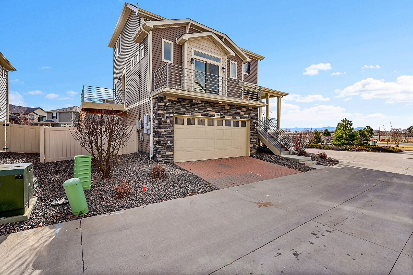 Balcony, Basement Garage, Built In Garage, Downspout, Driveway, Fence, Gutters, Horizontal Siding, Pad Mount Transformer, Porch, Residential View, Shake Shingle Siding, Stairs, Stone Siding, Driveway, Porch, Stairs
