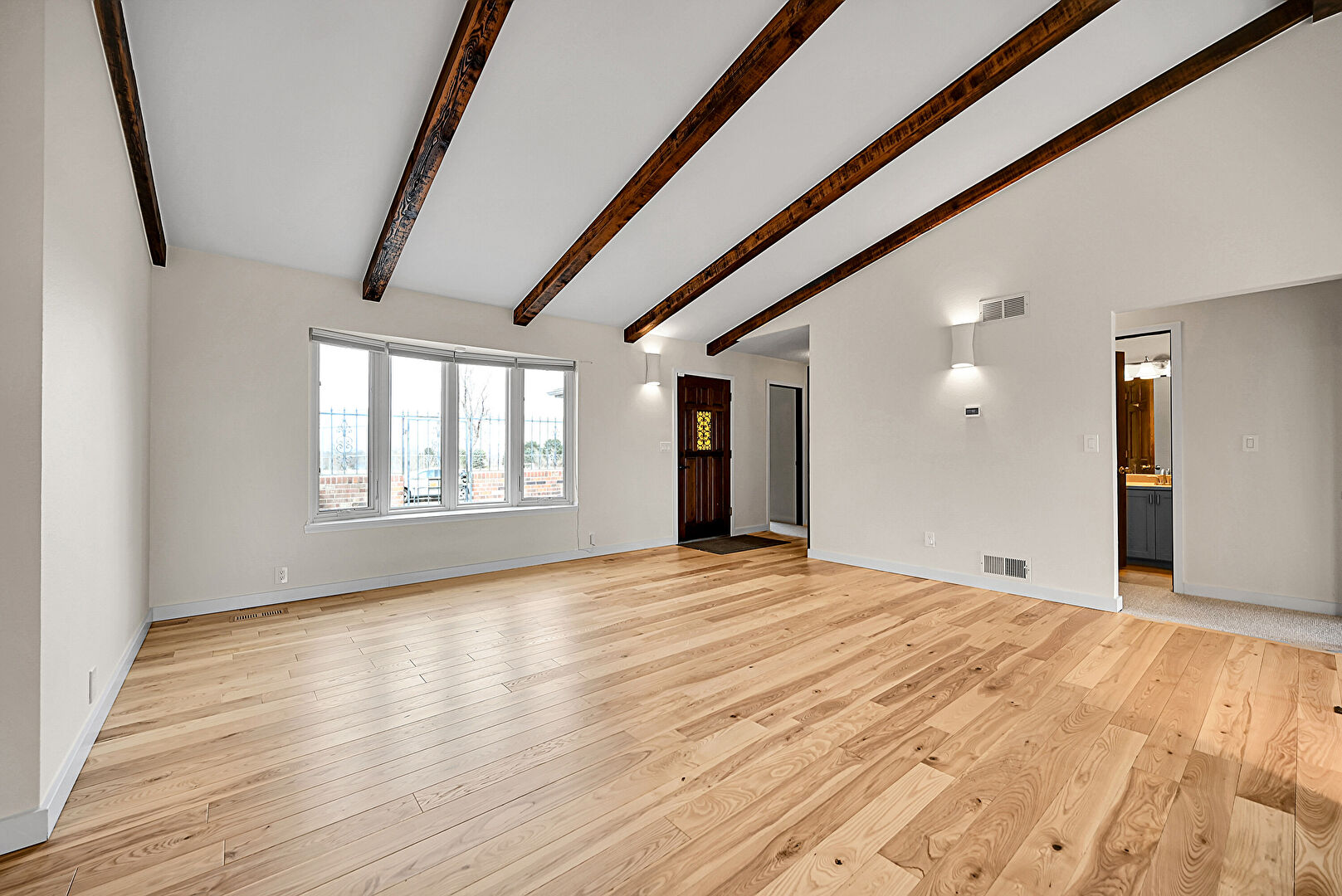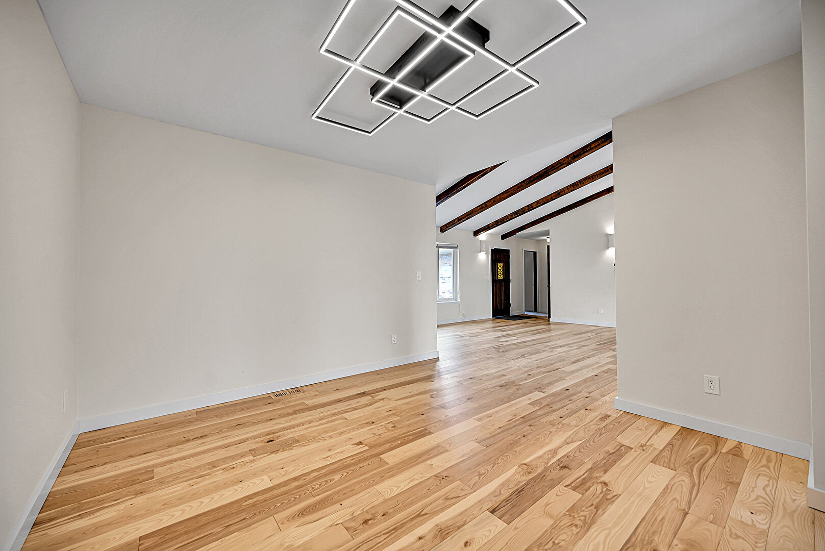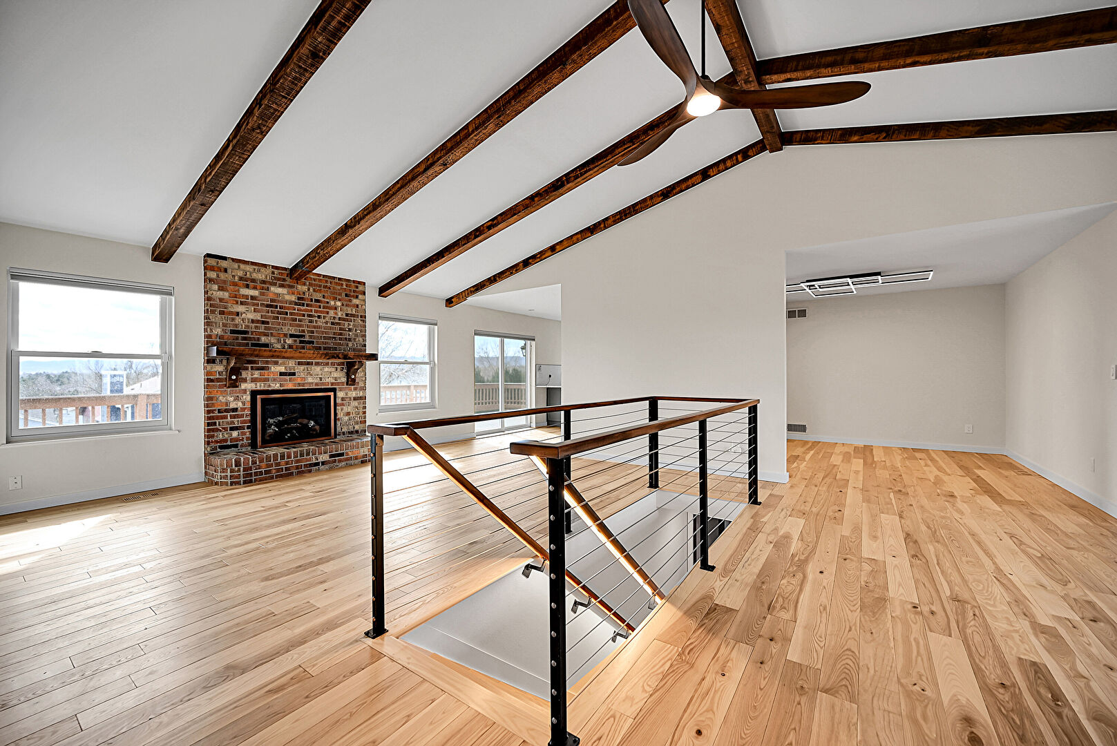 Baseboards Wall, Beamed Ceiling, Cathedral Ceiling, Ceiling Fan, Drywall, Fireplace, High Ceiling, Natural Light, Vaulted Ceiling, Vent, Wood Finish Floor, Baseboards Wall, Beamed Ceiling, Ceiling Fan, Fireplace, Vent, Wood Finish Floor