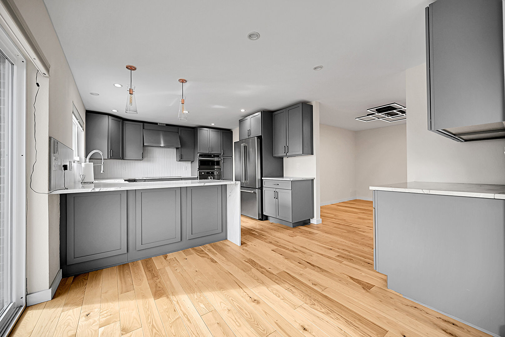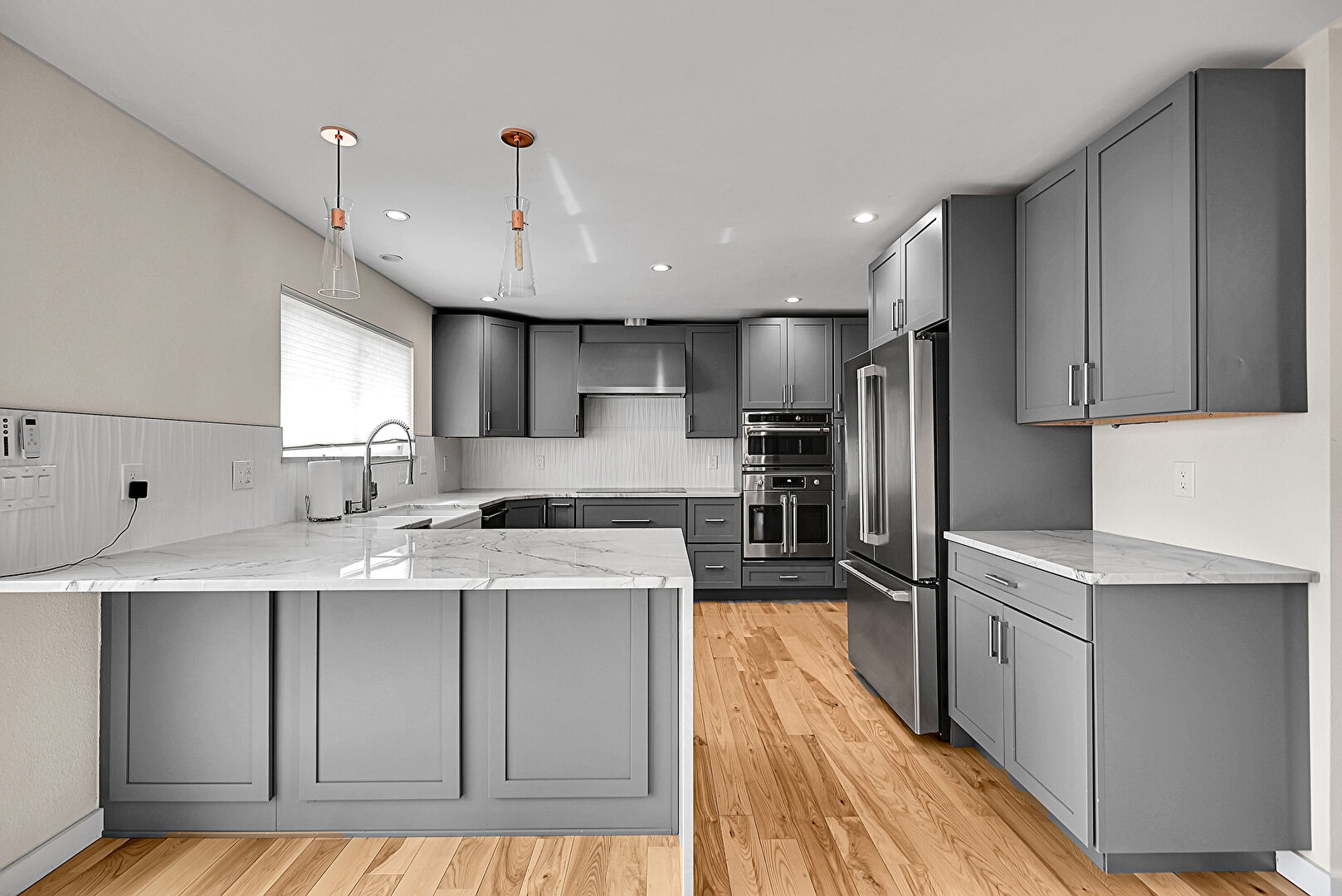 Baseboards Wall, Beamed Ceiling, Double Oven, Drywall, G Shaped Kitchen, Glass Insert Cabinets, Gray Cabinets, Kitchen Bar, Kitchen Peninsula, Natural Light, Pendant Lighting, Recessed Lighting, Shaker Cabinets, Stone Countertops, Vaulted Ceiling, Wainscot Wall, Wood Finish Floor, Fireplace, Kitchen Peninsula, Recessed Lighting, Shaker Cabinets, Wainscot Wall, Wood Finish Floor