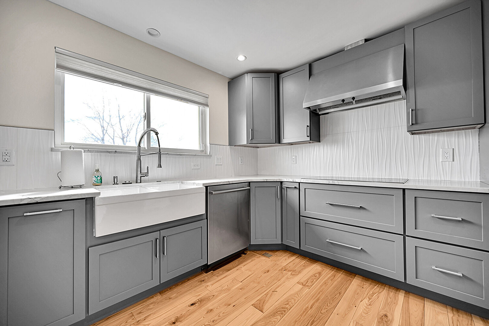 Baseboards Wall, Beamed Ceiling, Drywall, Fireplace, Glass Insert Cabinets, Gray Cabinets, Indoor Bar, Natural Light, Shaker Cabinets, Stone Countertops, Vaulted Ceiling, Wine Cooler, Wood Finish Floor, Gray Cabinets, Natural Light