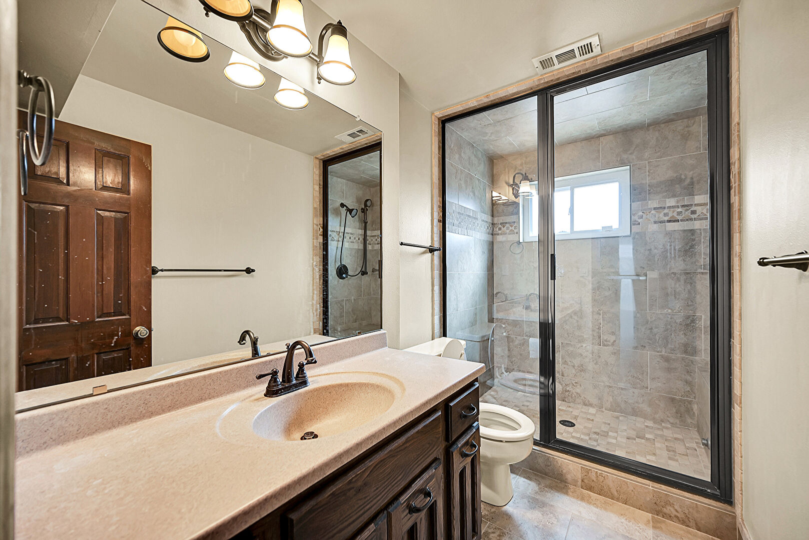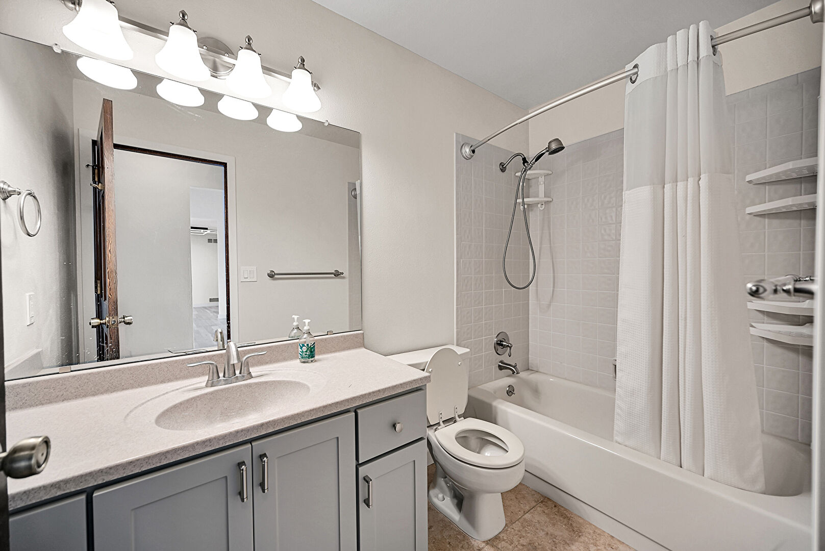 Combined Bath Shower, Drywall, Full Bathroom, Vanity, Tile Floor