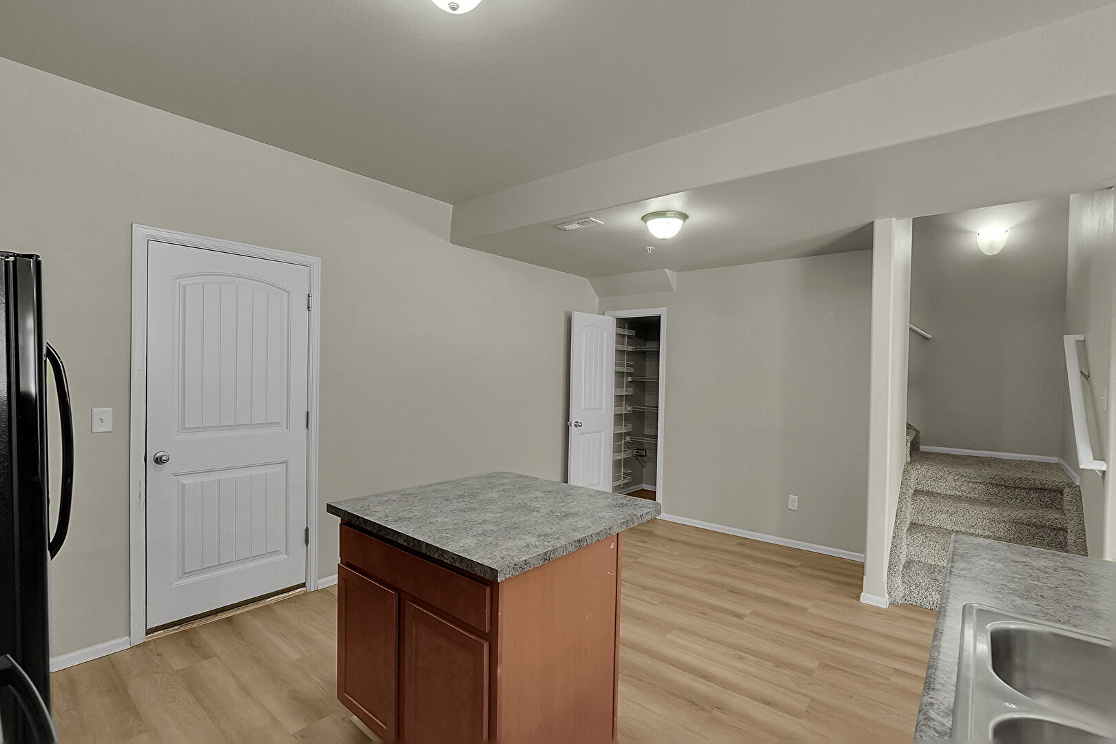 Baseboards Wall, Drywall, Kitchen Island, L Shaped Kitchen, Medium Brown Cabinets, Shaker Cabinets, Stone Countertops, Vent, Wood Finish Floor, Drywall, L Shaped Kitchen, Wood Finish Floor