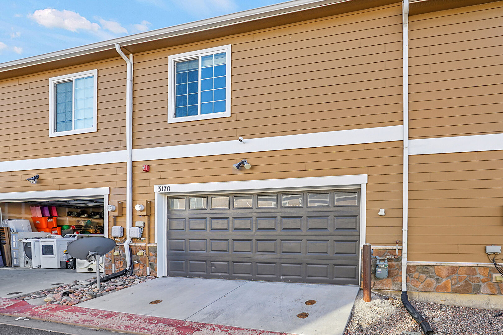 Built In Garage, Downspout, Driveway, Electric Meter, Gas Meter, Gutters, Horizontal Siding, Satellite Dish, Stone Siding, Washer Dryer, Gutters, Satellite Dish, Stone Siding