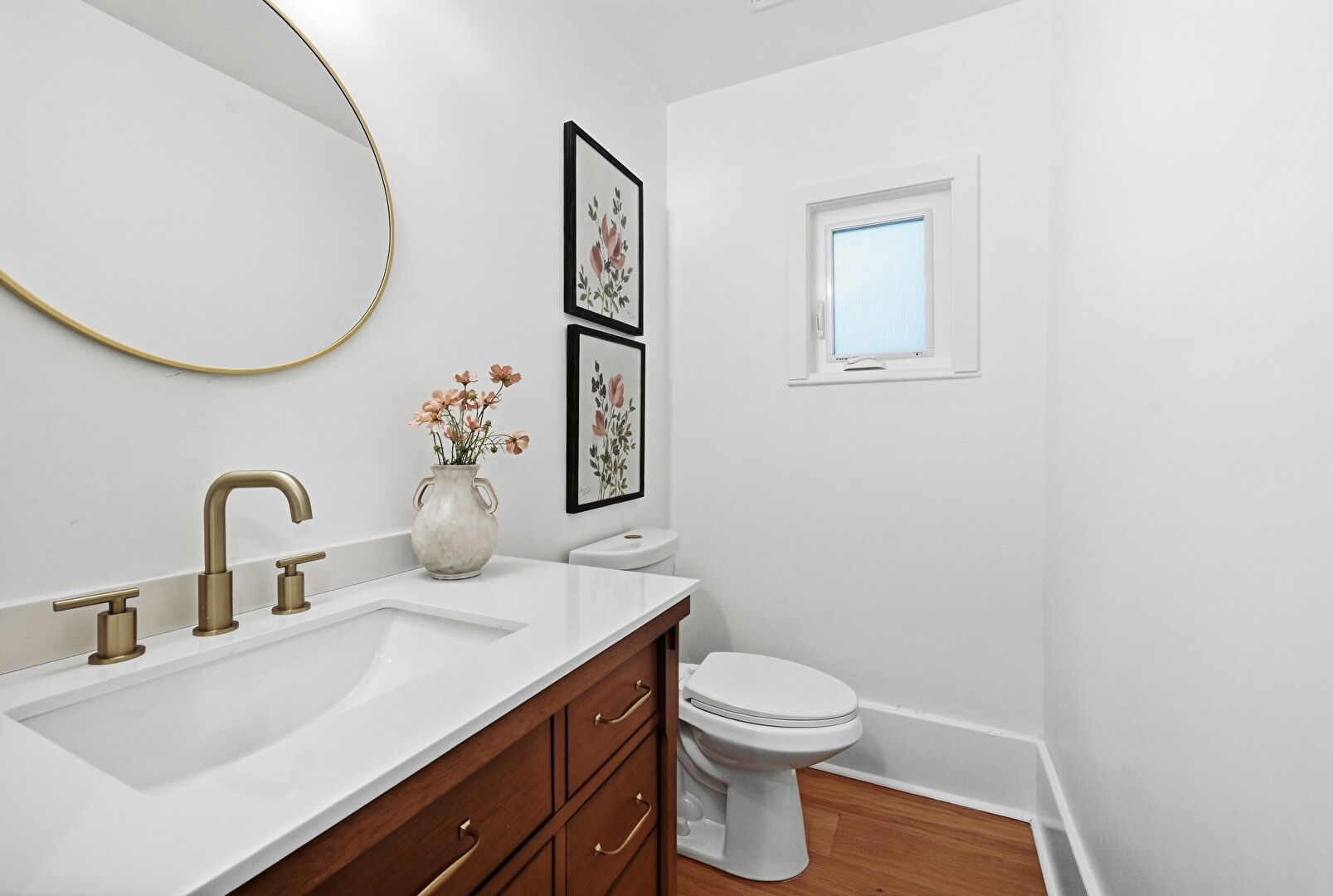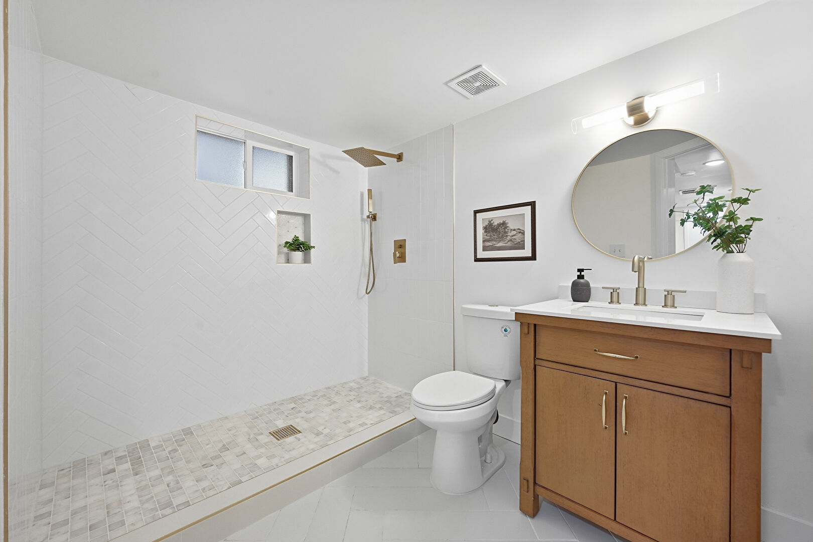 Baseboards Wall, Basement, Drywall, Full Bathroom, Half Bathroom, Marble Finish Floor, Natural Light, Tile Floor, Vanity, Vent, Wood Finish Floor, Double Vanity, Drywall, Natural Light, Recessed Lighting, Vent