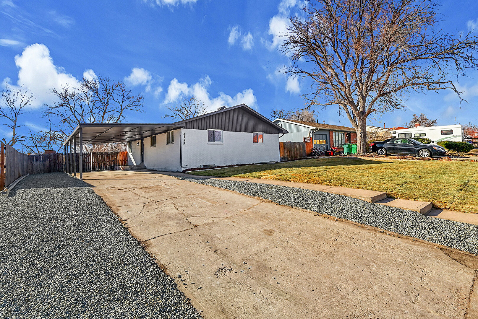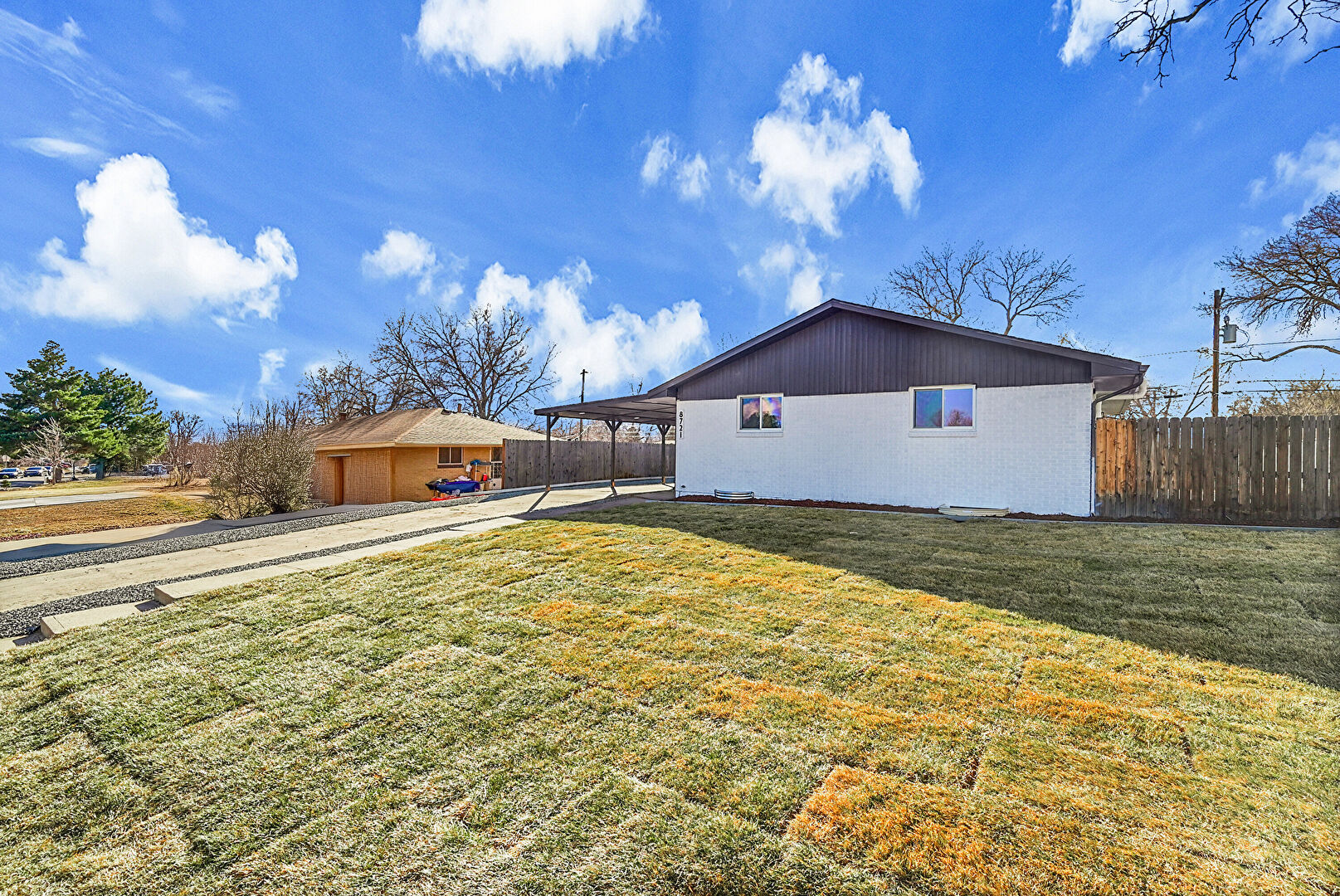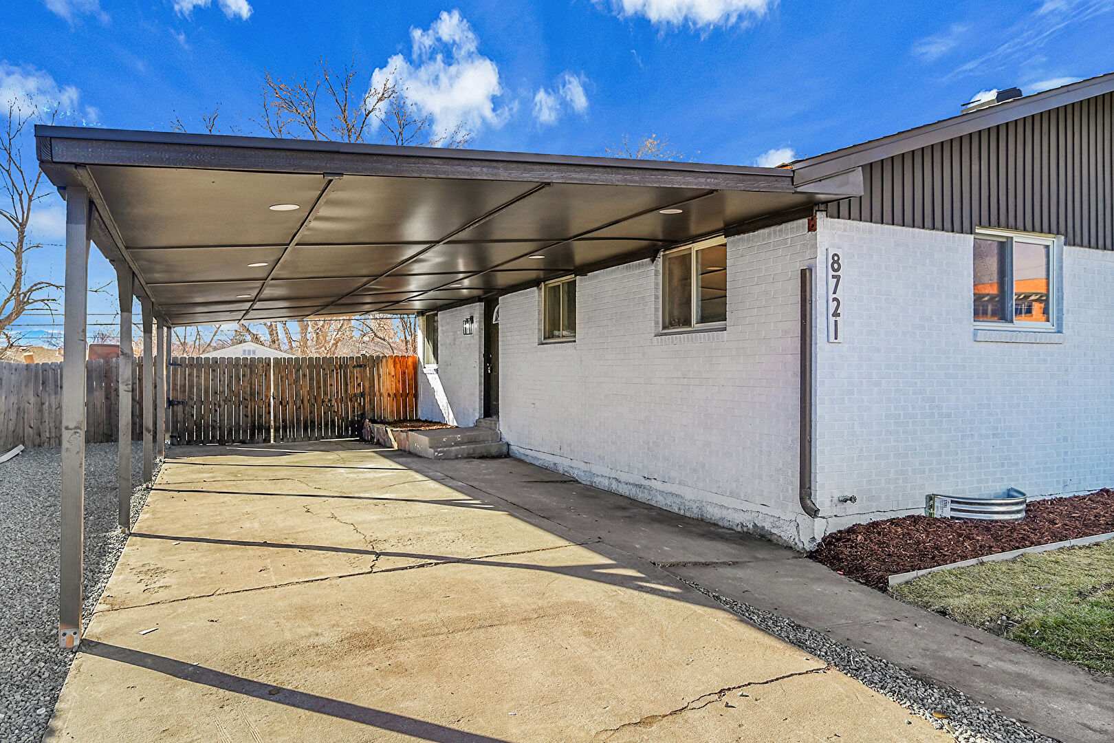 Attached Carport, Brick Siding, Concrete Foundation, Driveway, Fence, Patio, Vertical Siding, Downspout