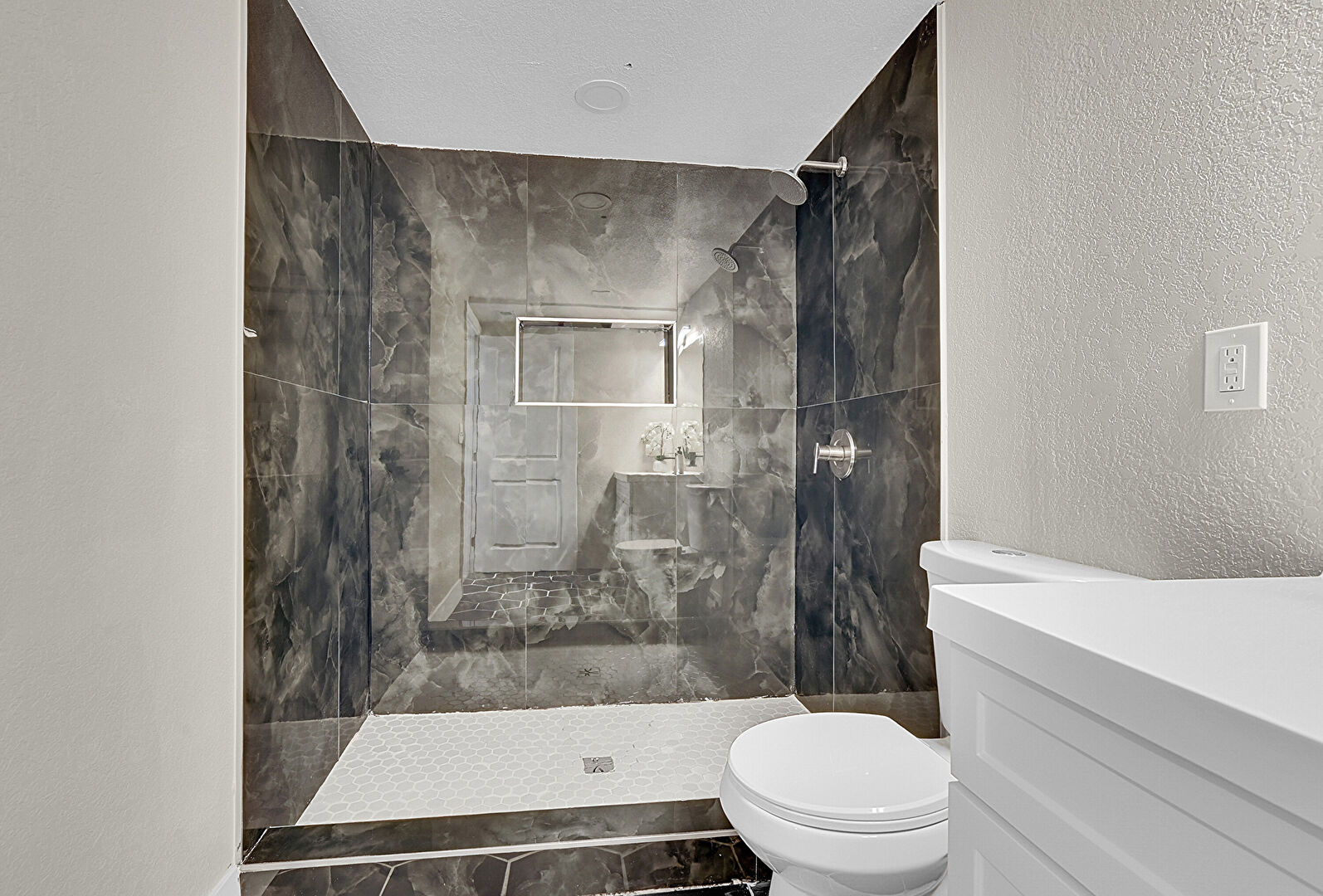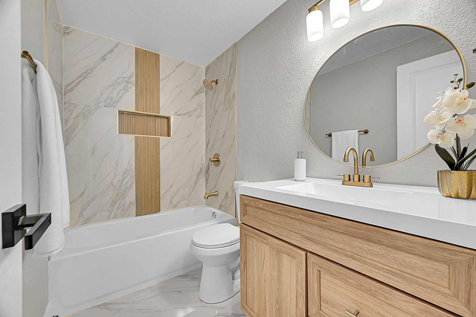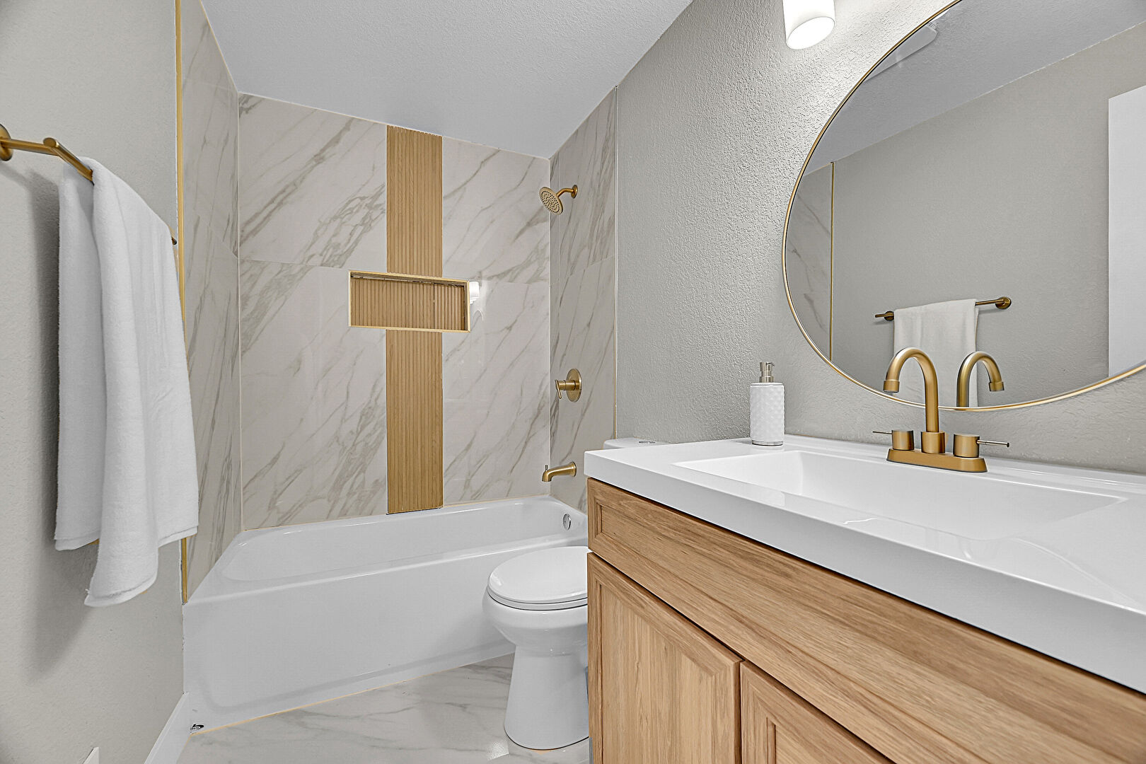 Combined Bath Shower, Full Bathroom, Marble Finish Floor, Vanity, Textured Wall