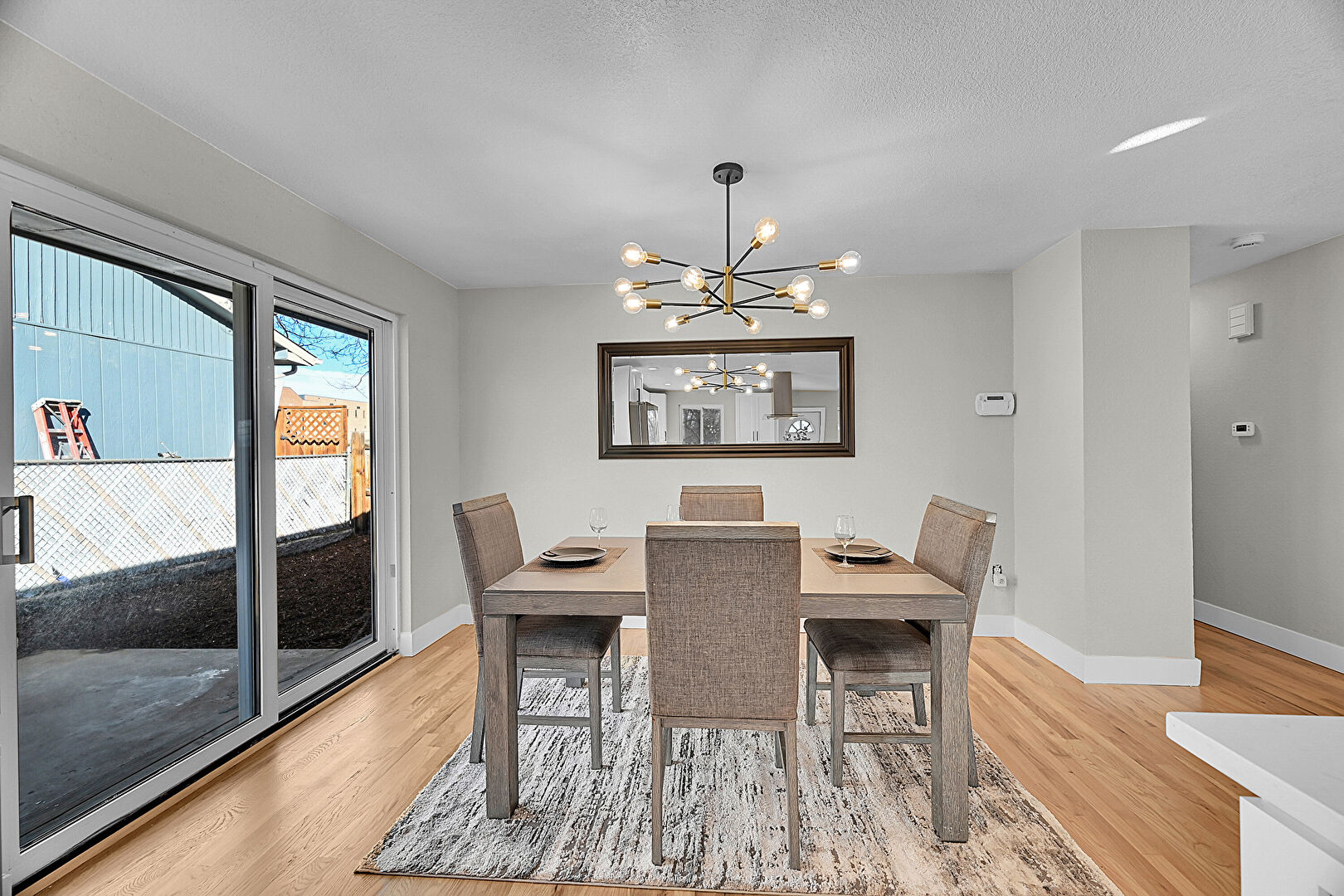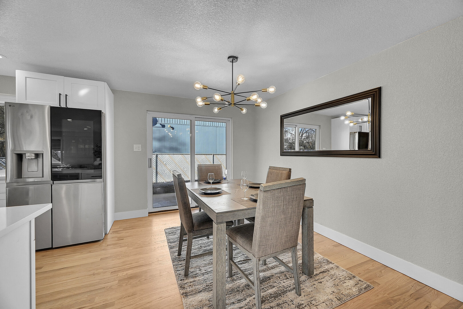 Baseboards Wall, Drywall, Natural Light, Notable Chandelier, Textured Ceiling, Textured Wall, Wood Finish Floor, Natural Light, Notable Chandelier