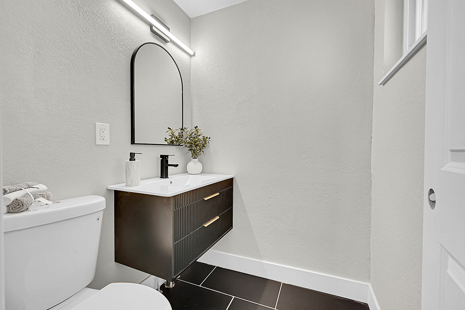 Baseboards Wall, Textured Wall, Tile Floor, Vanity, Half Bathroom