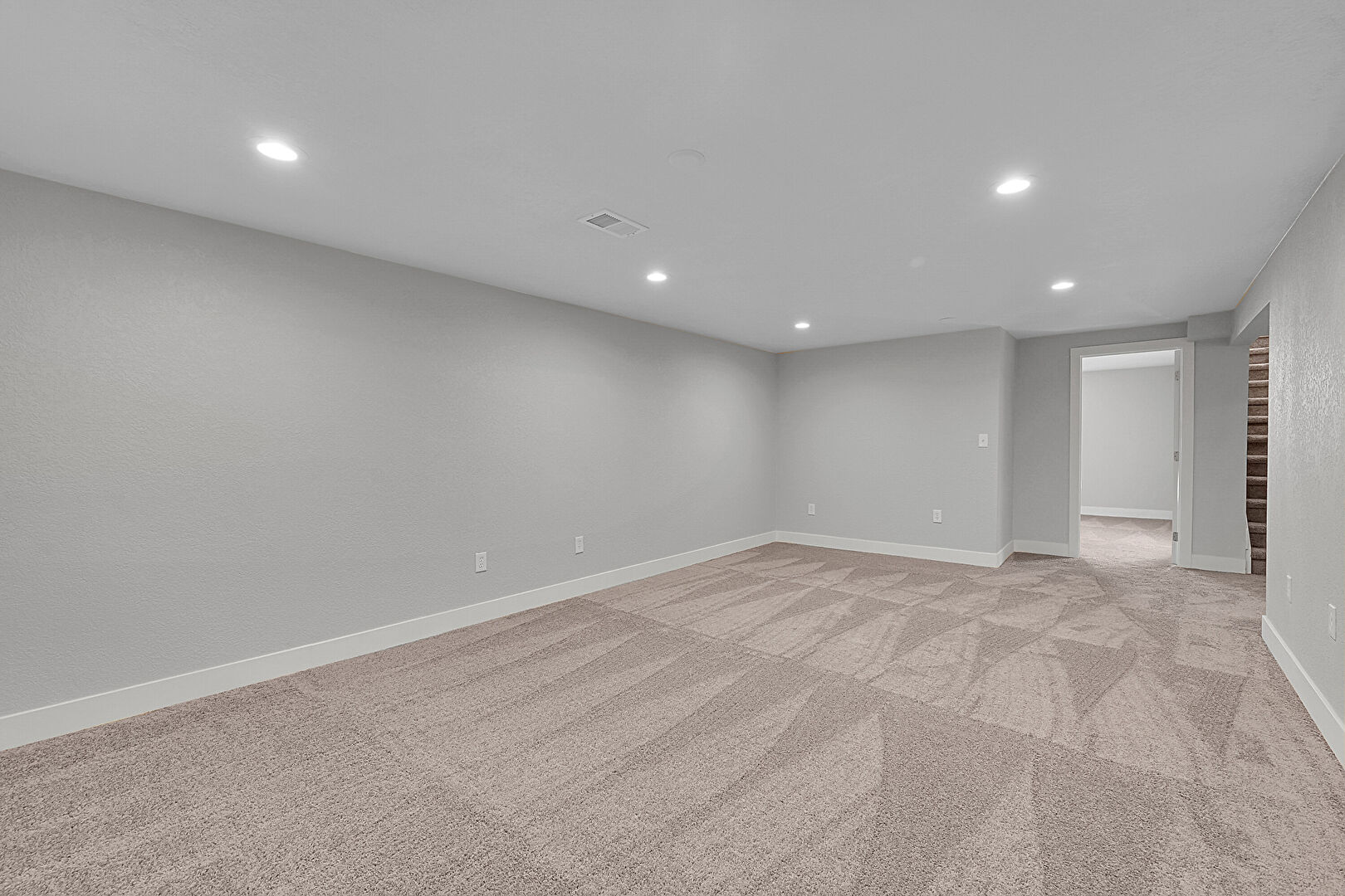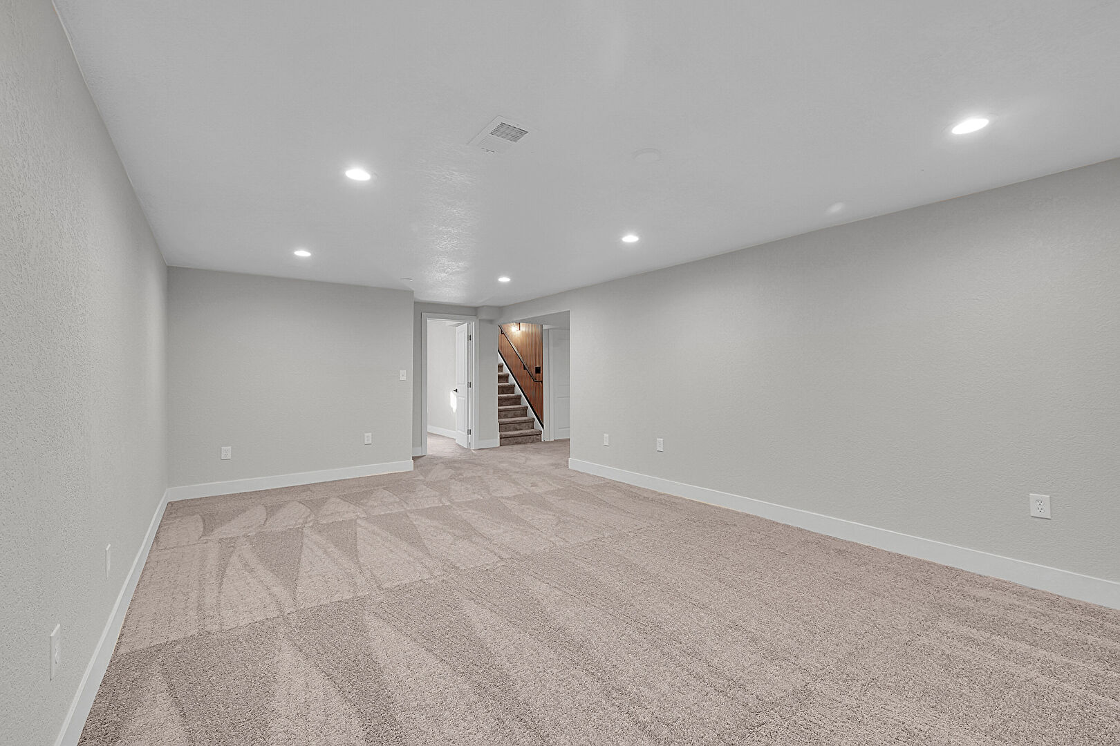 Baseboards Wall, Basement, Carpet, Drywall, Natural Light, Recessed Lighting, Stairs, Textured Wall, Vent, Basement, Carpet, Recessed Lighting