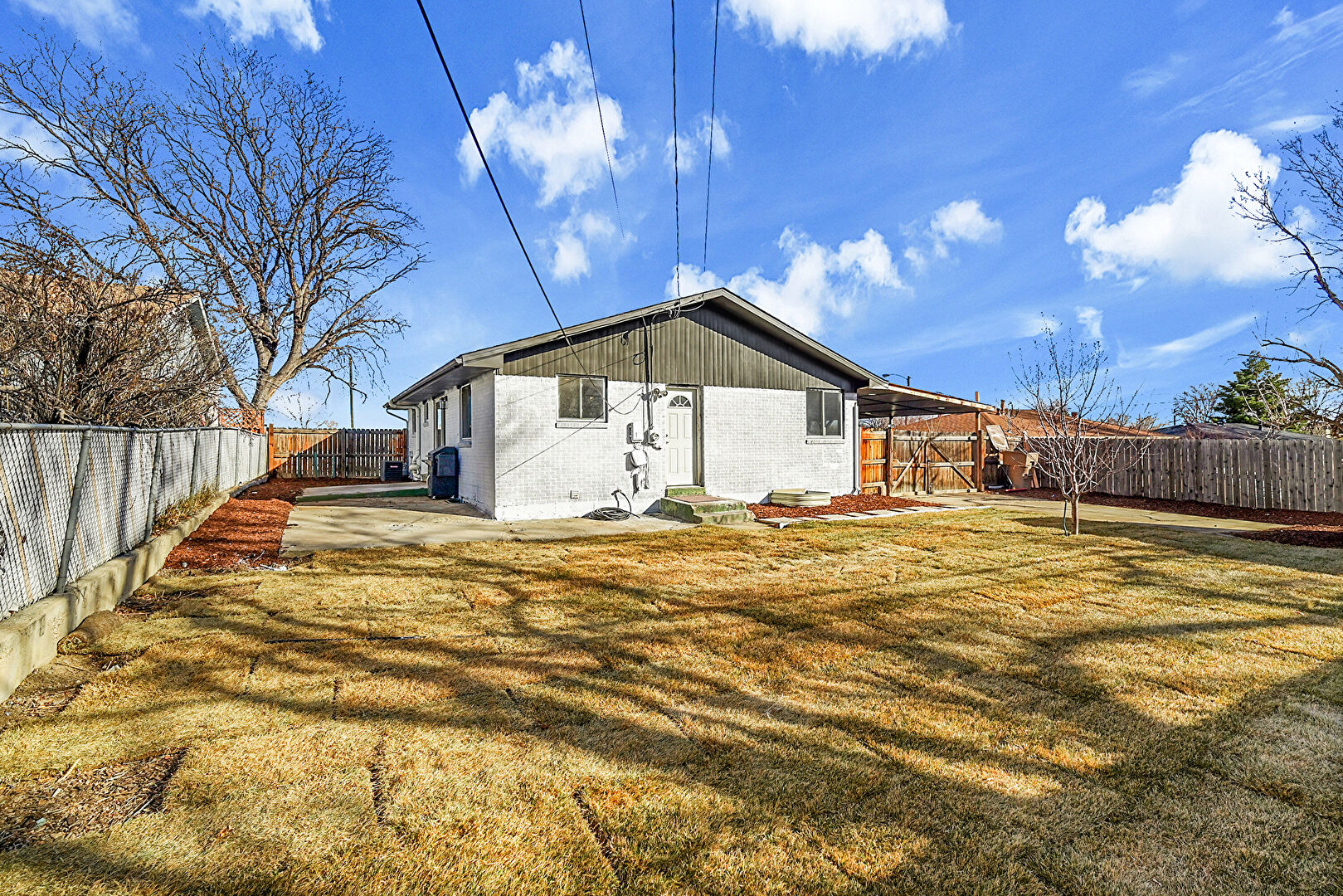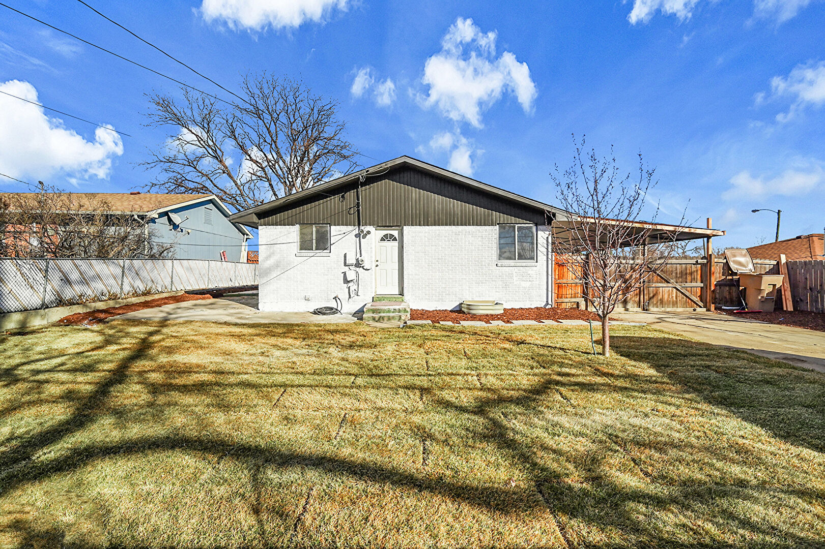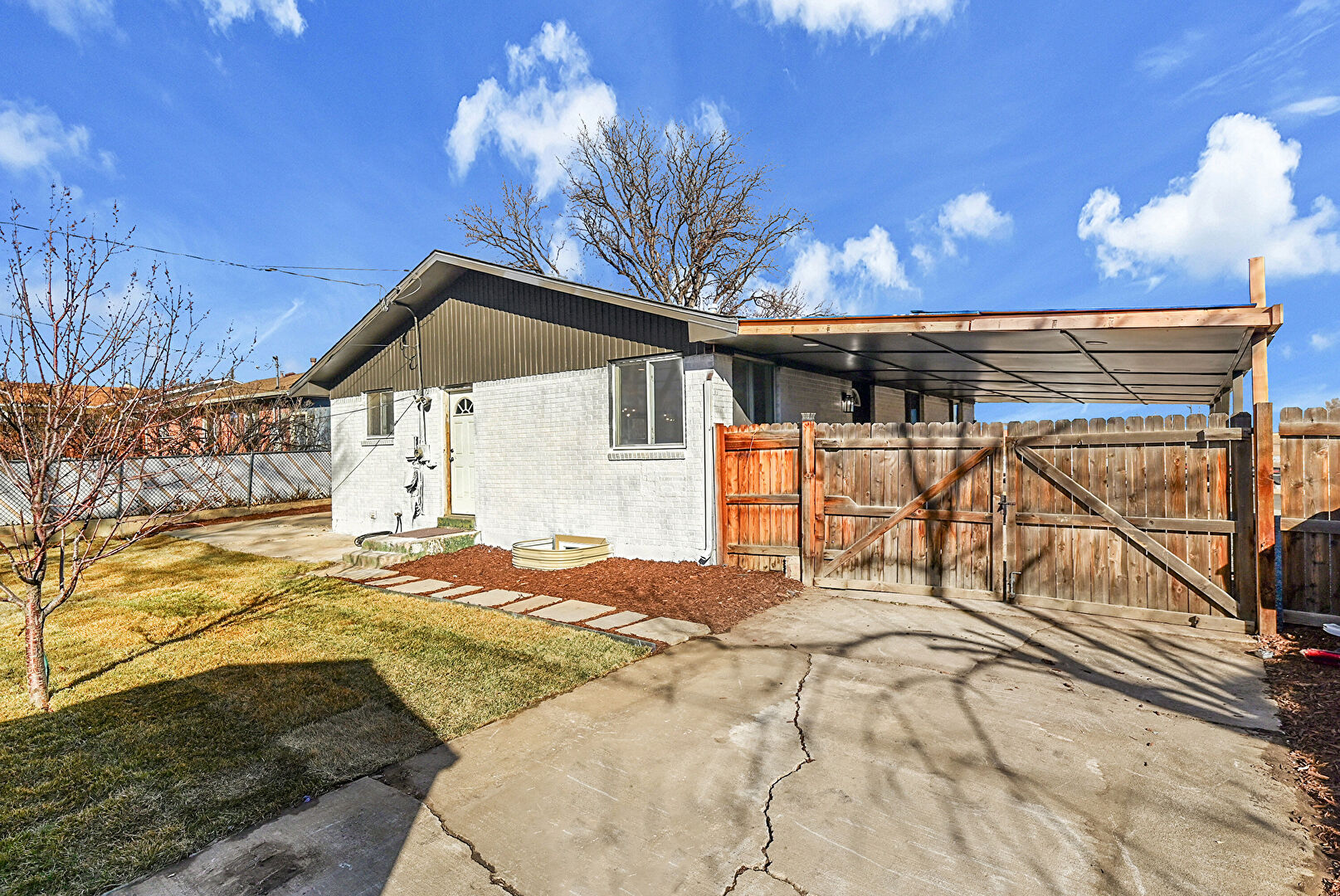 Attached Carport, Brick Siding, Concrete Foundation, Downspout, Driveway, Fence, Gutters, Lawn, Parking Pad, Patio, Vertical Siding, Attached Carport, Driveway, Lawn, Vertical Siding