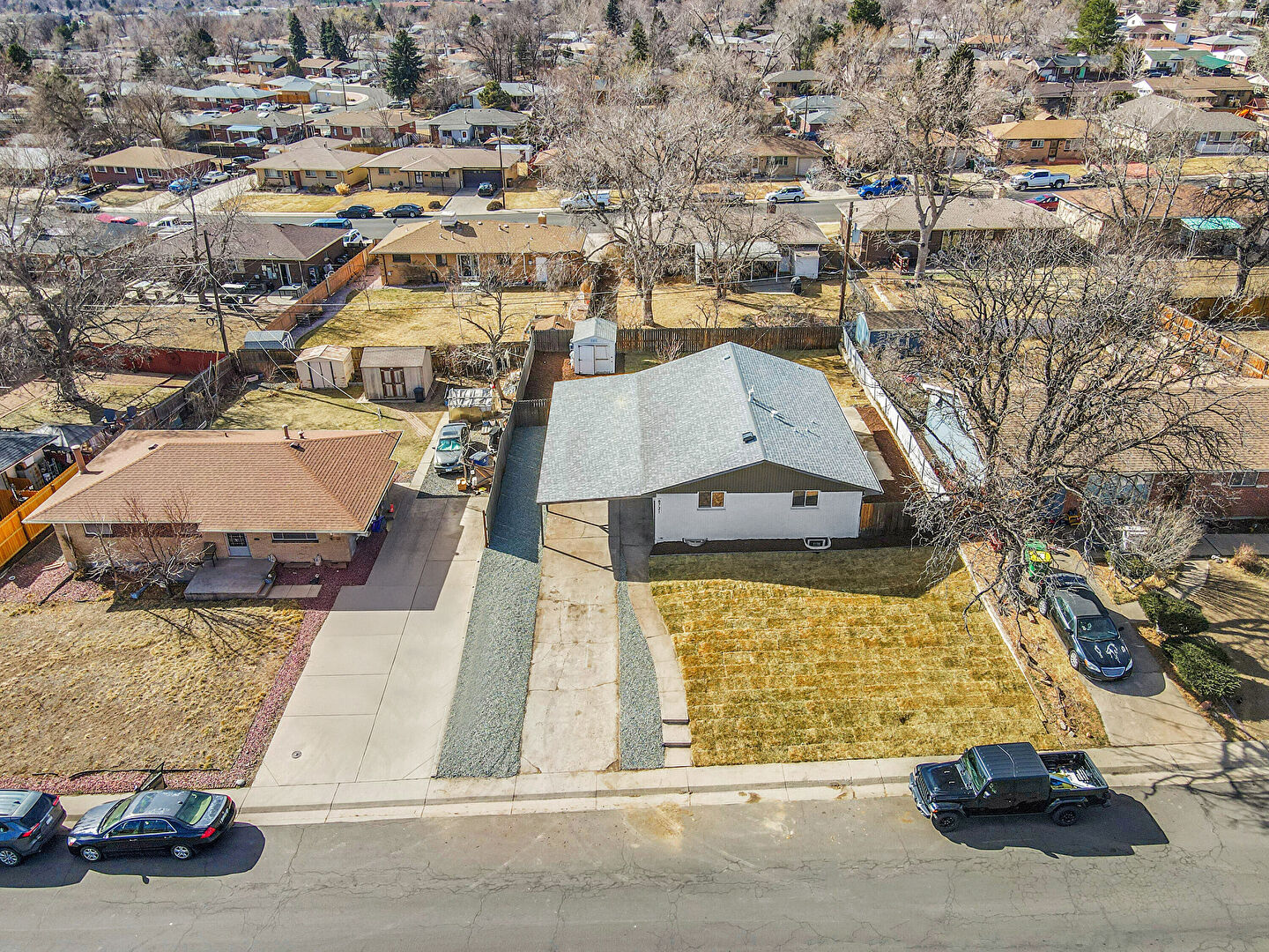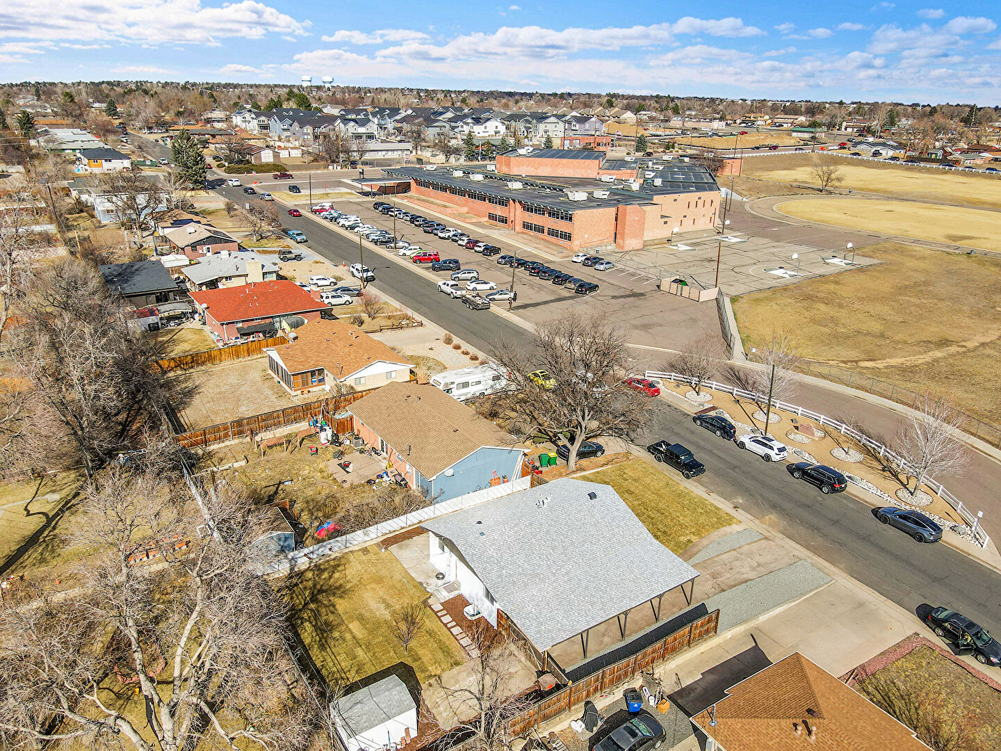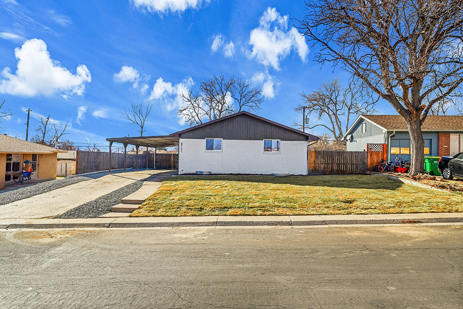Attached Carport, Brick Siding, Concrete Foundation, Downspout, Driveway, Fence, Gutters, Lawn, Parking Pad, Patio, Vertical Siding, Attached Carport, Driveway, Lawn, Vertical Siding