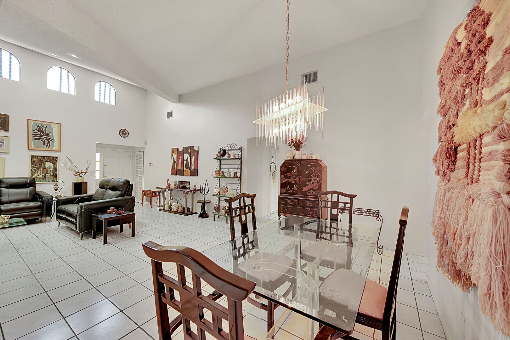 Ceiling Fan, Drywall, High Ceiling, Natural Light, Notable Chandelier, Textured Ceiling, Tile Floor, Vaulted Ceiling, Vent, Wallpaper Wall, Notable Chandelier, Tile Floor