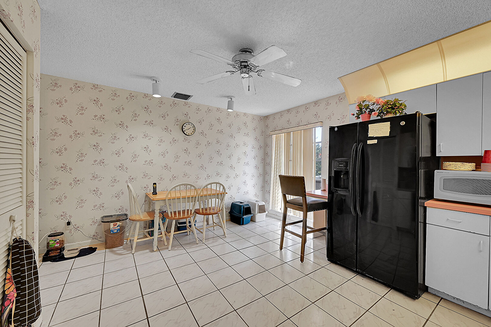 Ceiling Fan, Pass Through Window, Textured Ceiling, Tile Floor, Toaster, Vent, Wallpaper Wall, Ceiling Fan, Pass Through Window, Toaster