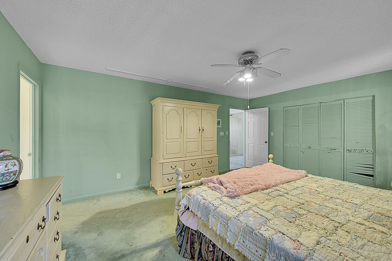 Baseboards Wall, Carpet, Ceiling Fan, Drywall, Natural Light, Office Area, Textured Ceiling, Track Lighting, Vent, Carpet, Two Closets