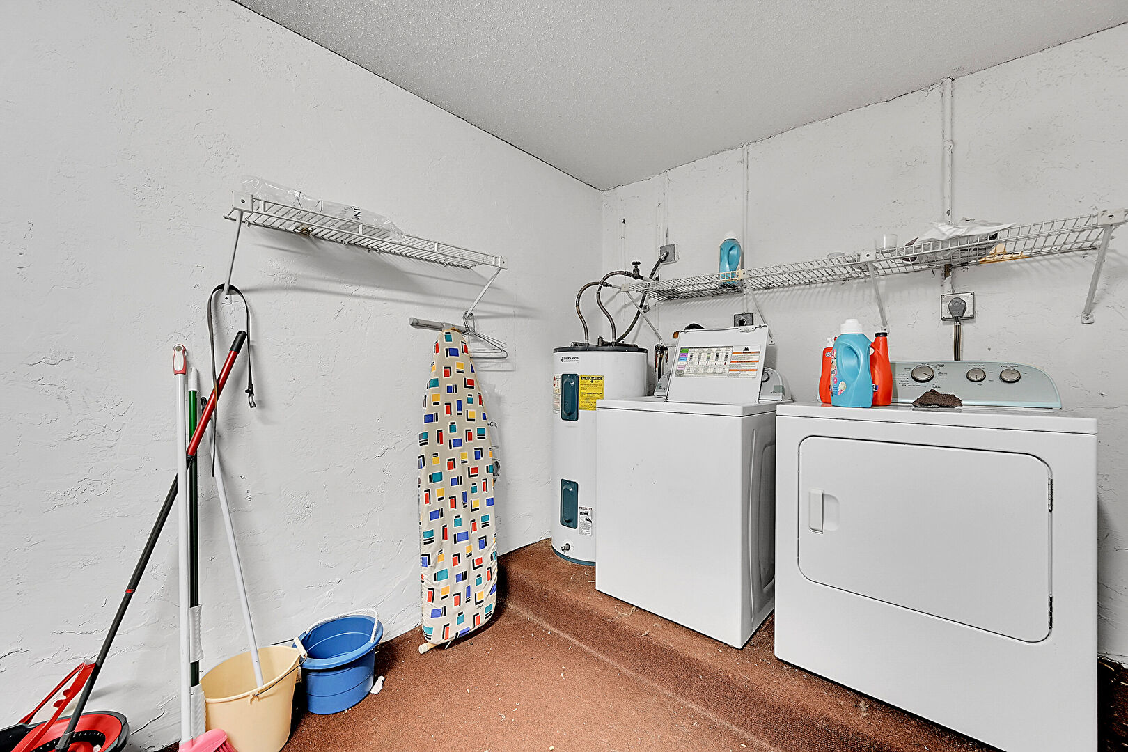 Concrete Floor, Electric Dryer Hookup, Laundry, Textured Wall, Water Heater