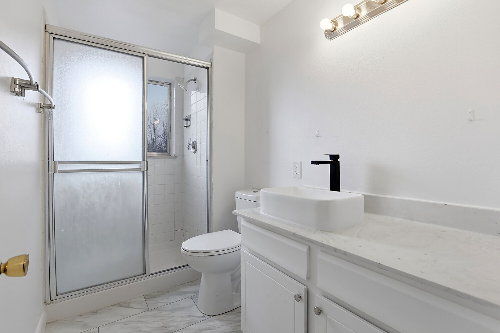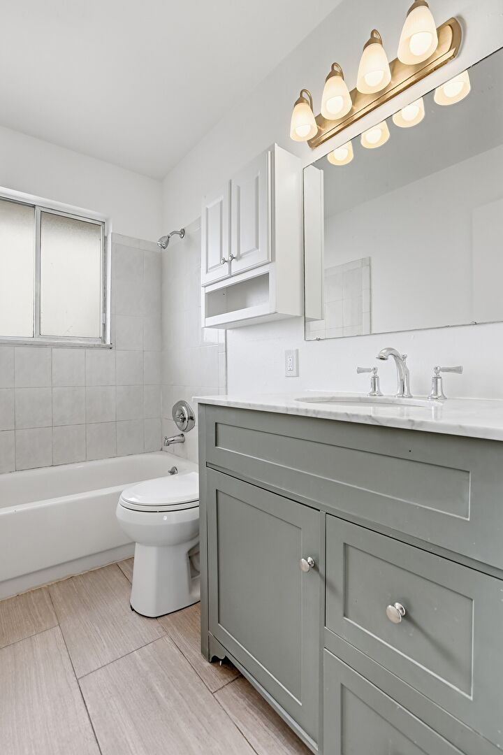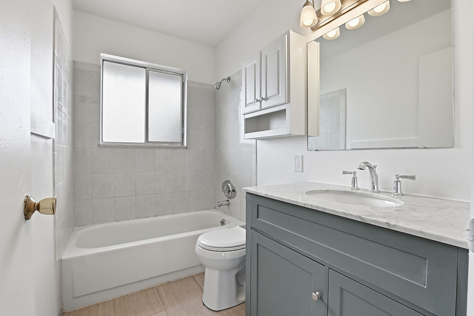 Combined Bath Shower, Drywall, Full Bathroom, Natural Light, Vanity, Wood Finish Floor, Marble Finish Floor, Natural Light, Vanity