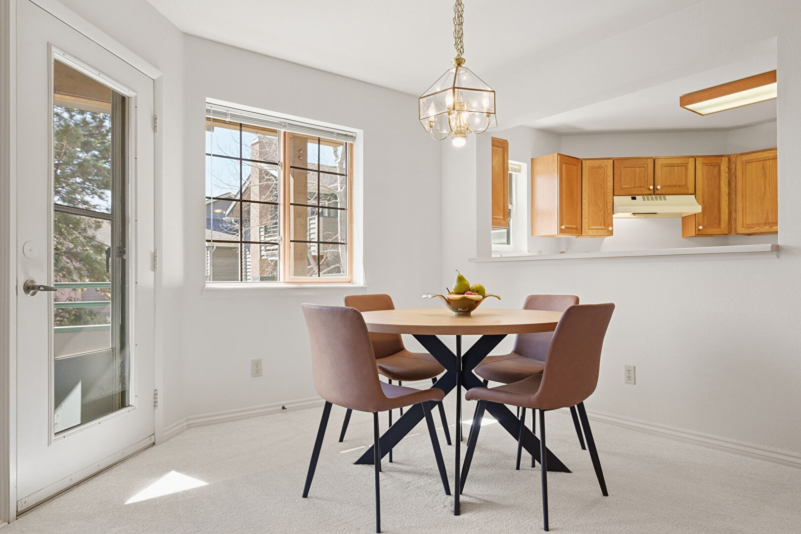 Drywall, G Shaped Kitchen, Kitchen Peninsula, Medium Brown Cabinets, Natural Light, Notable Chandelier, Pass Through Window, Pendant Lighting, Raised Cabinets, Wood Finish Floor, Drywall, Medium Brown Cabinets, Natural Light