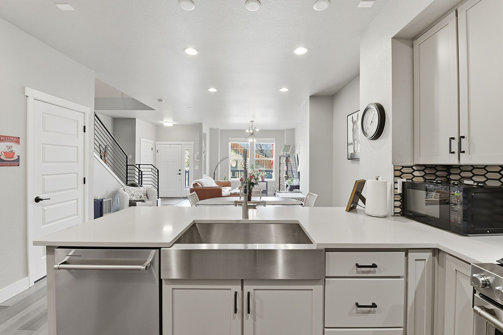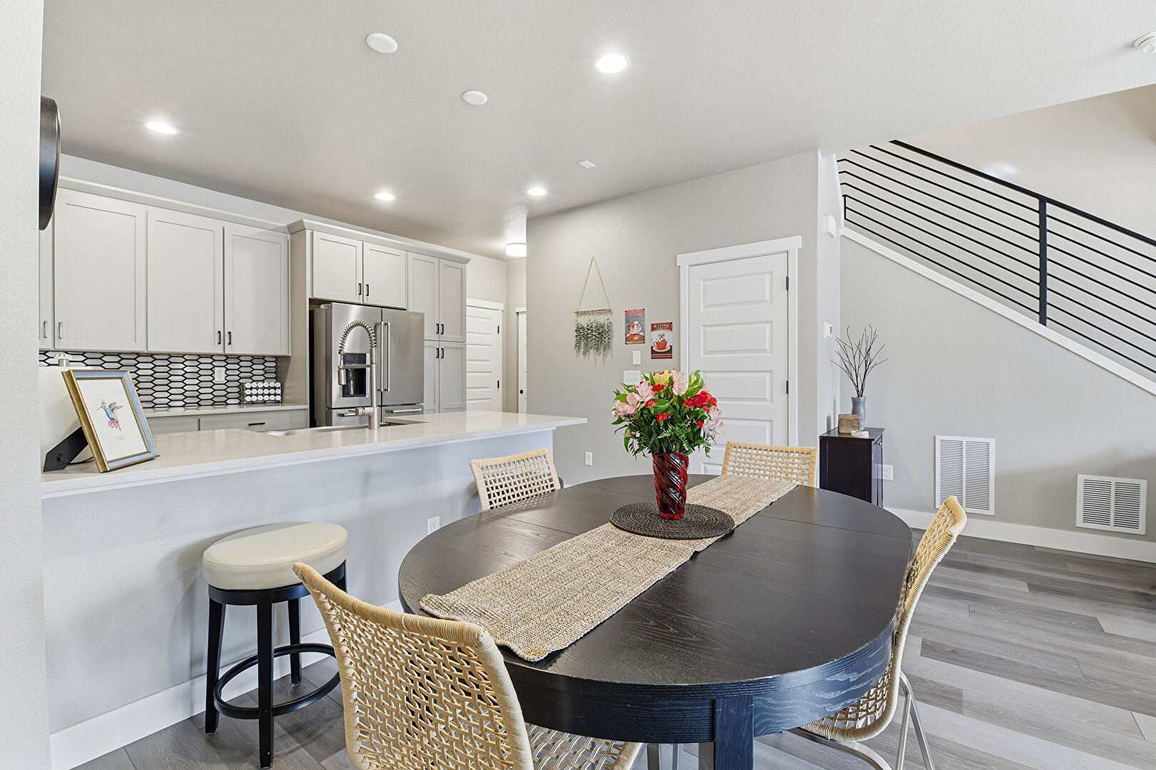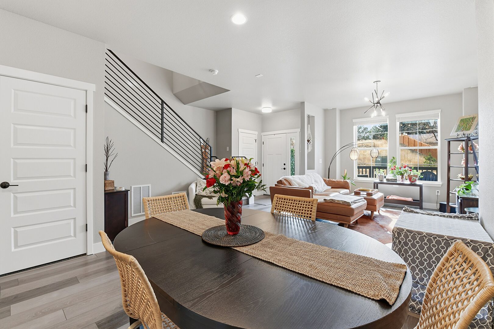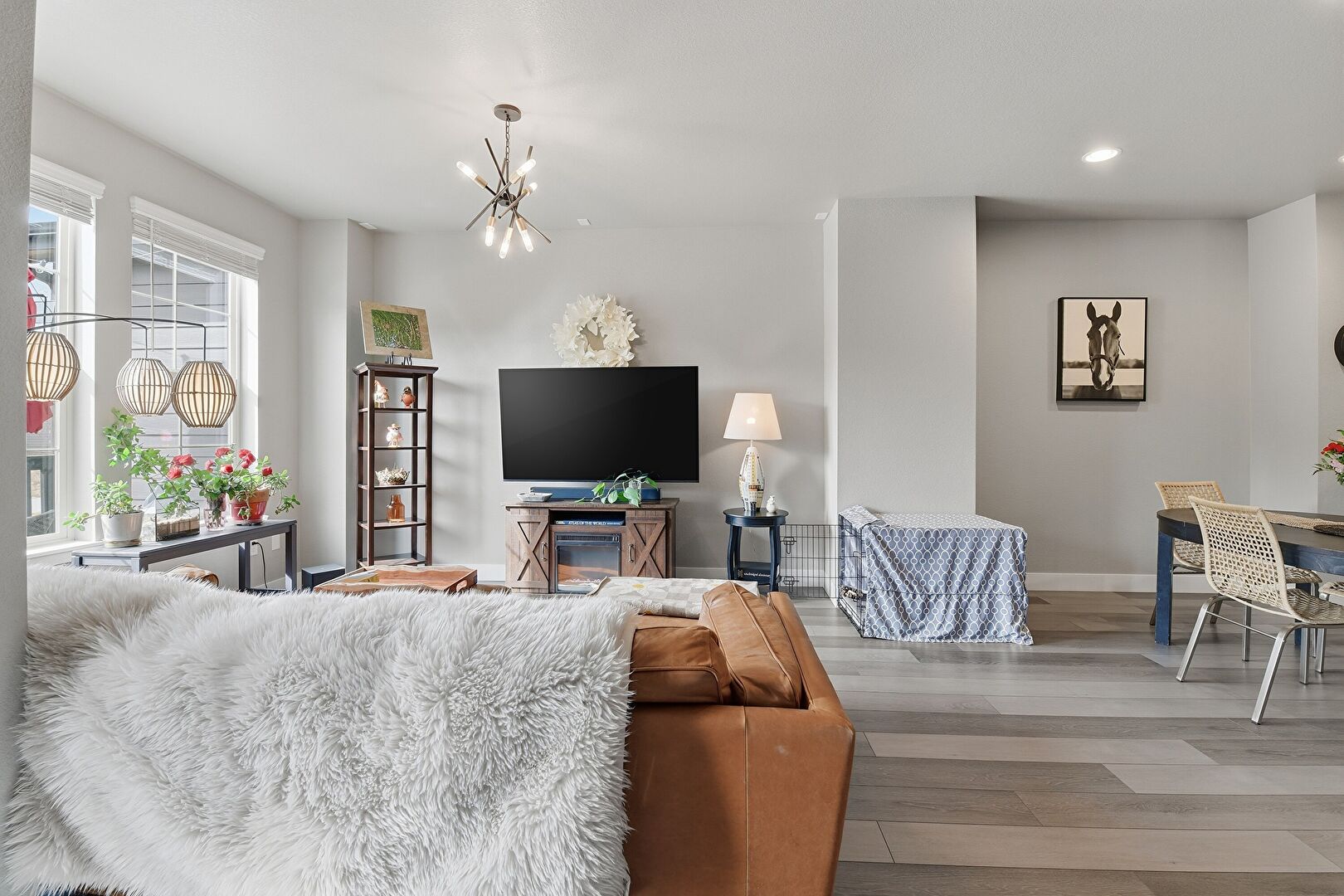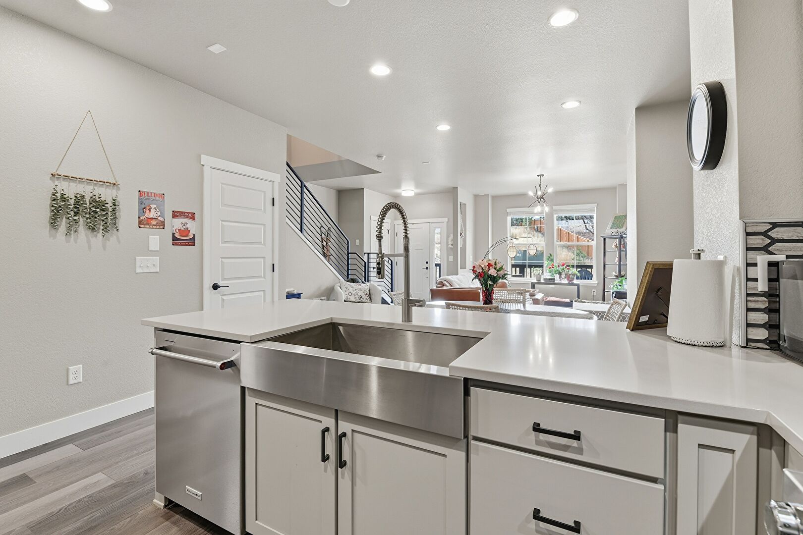 Baseboards Wall, Drywall, Natural Light, Notable Chandelier, Recessed Lighting, Stairs, U Shaped Kitchen, Wood Finish Floor, Notable Chandelier, Recessed Lighting, Wood Finish Floor