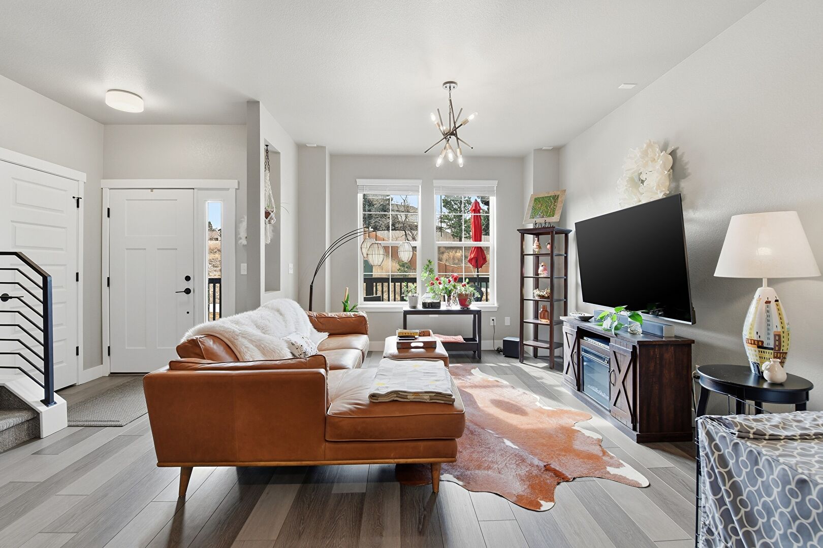 Baseboards Wall, Drywall, Natural Light, Notable Chandelier, Upstairs Landing, Vent, Wood Finish Floor