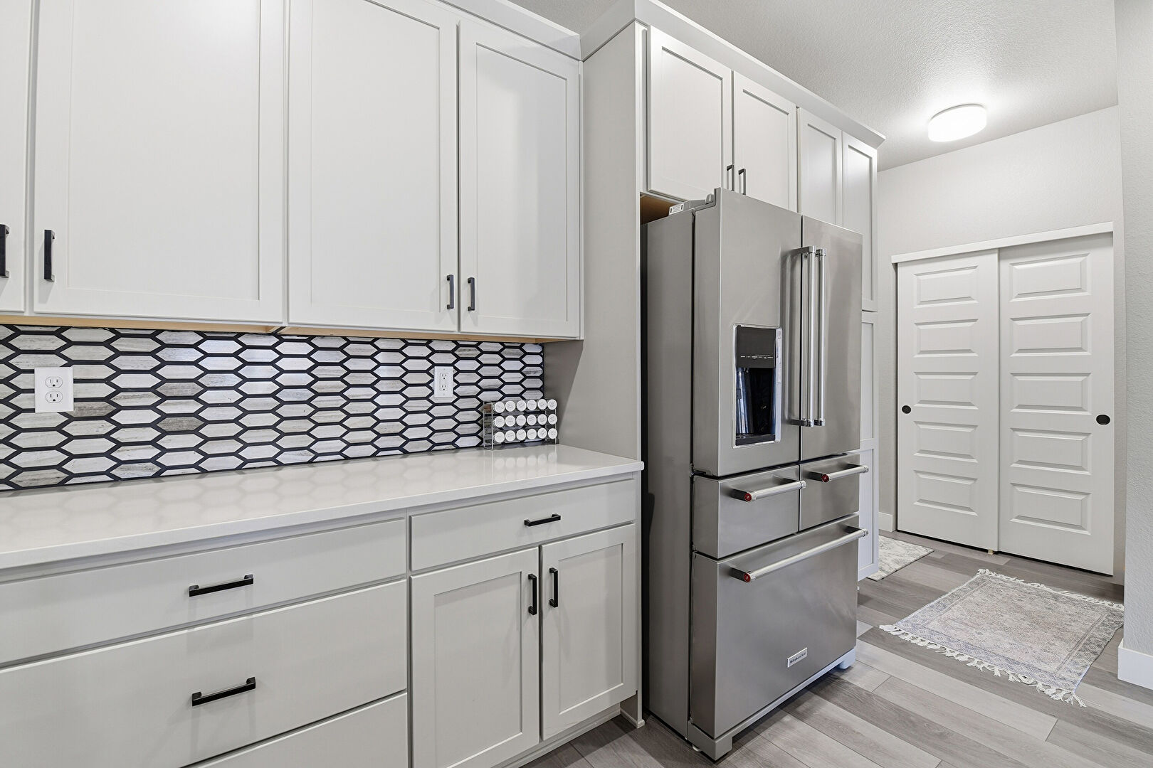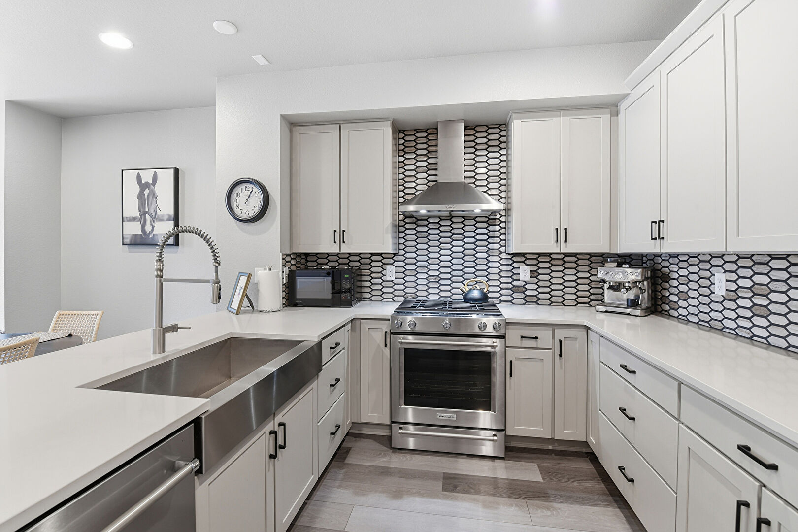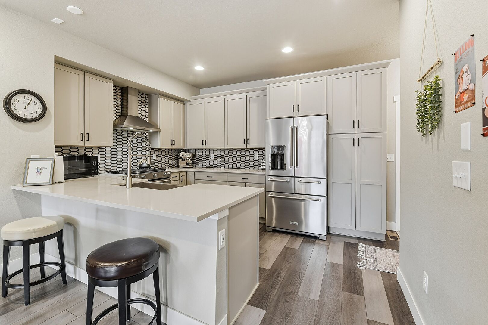 Baseboards Wall, Crown Molding Cabinets, Drywall, Kitchen Bar, Kitchen Peninsula, Natural Light, Notable Chandelier, Recessed Lighting, Shaker Cabinets, Stairs, Stone Countertops, U Shaped Kitchen, Vent, Wood Finish Floor, Baseboards Wall, U Shaped Kitchen, Wood Finish Floor