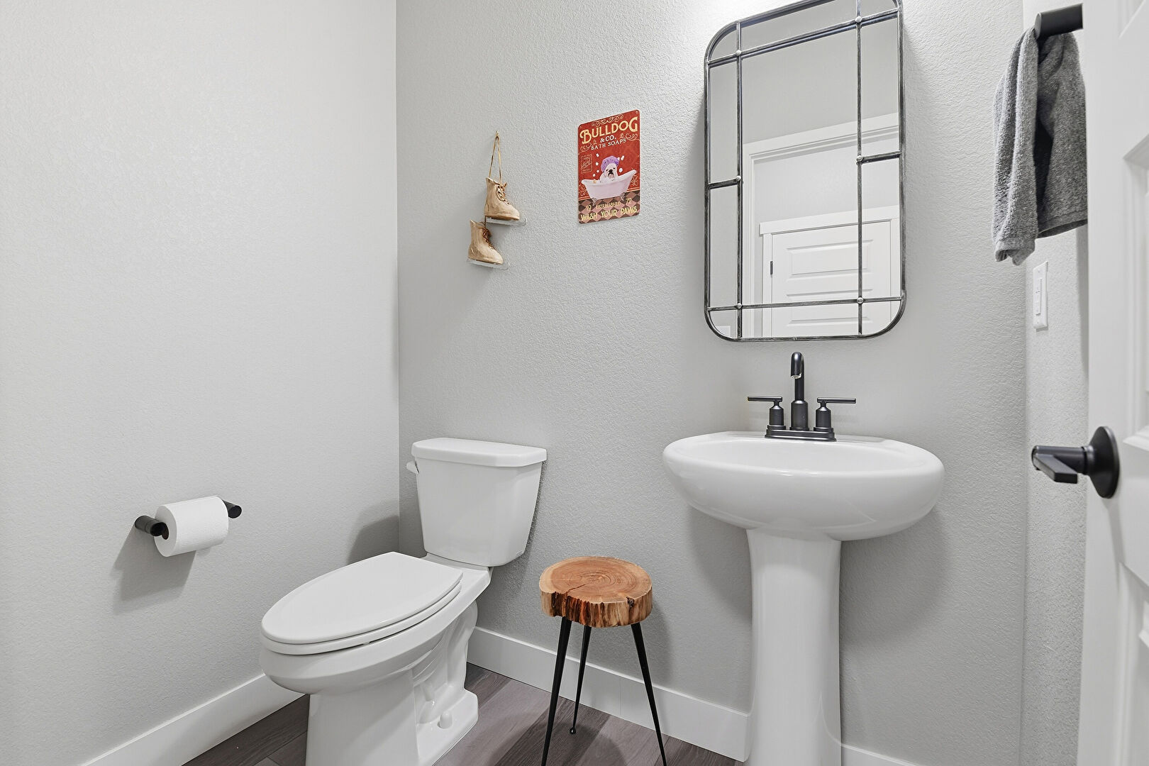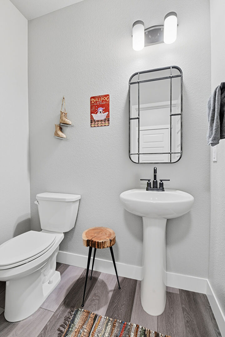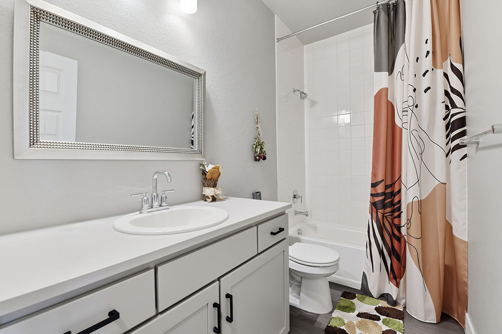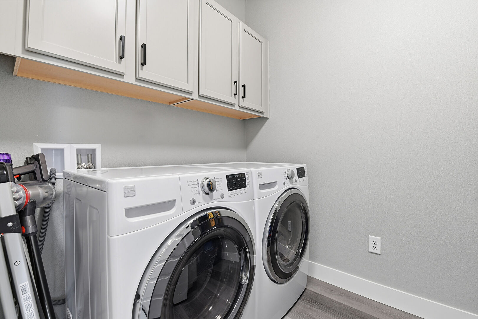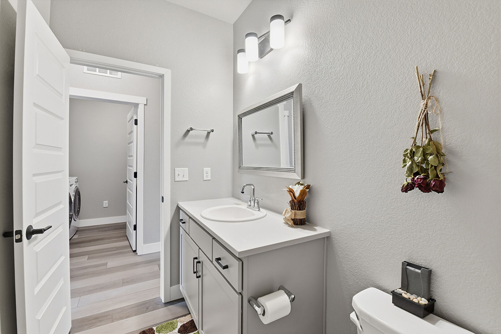 Baseboards Wall, Combined Bath Shower, Full Bathroom, Half Bathroom, Laundry, Textured Wall, Vanity, Vent, Washer Dryer, Wood Finish Floor, Combined Bath Shower, Half Bathroom, Textured Wall, Vanity