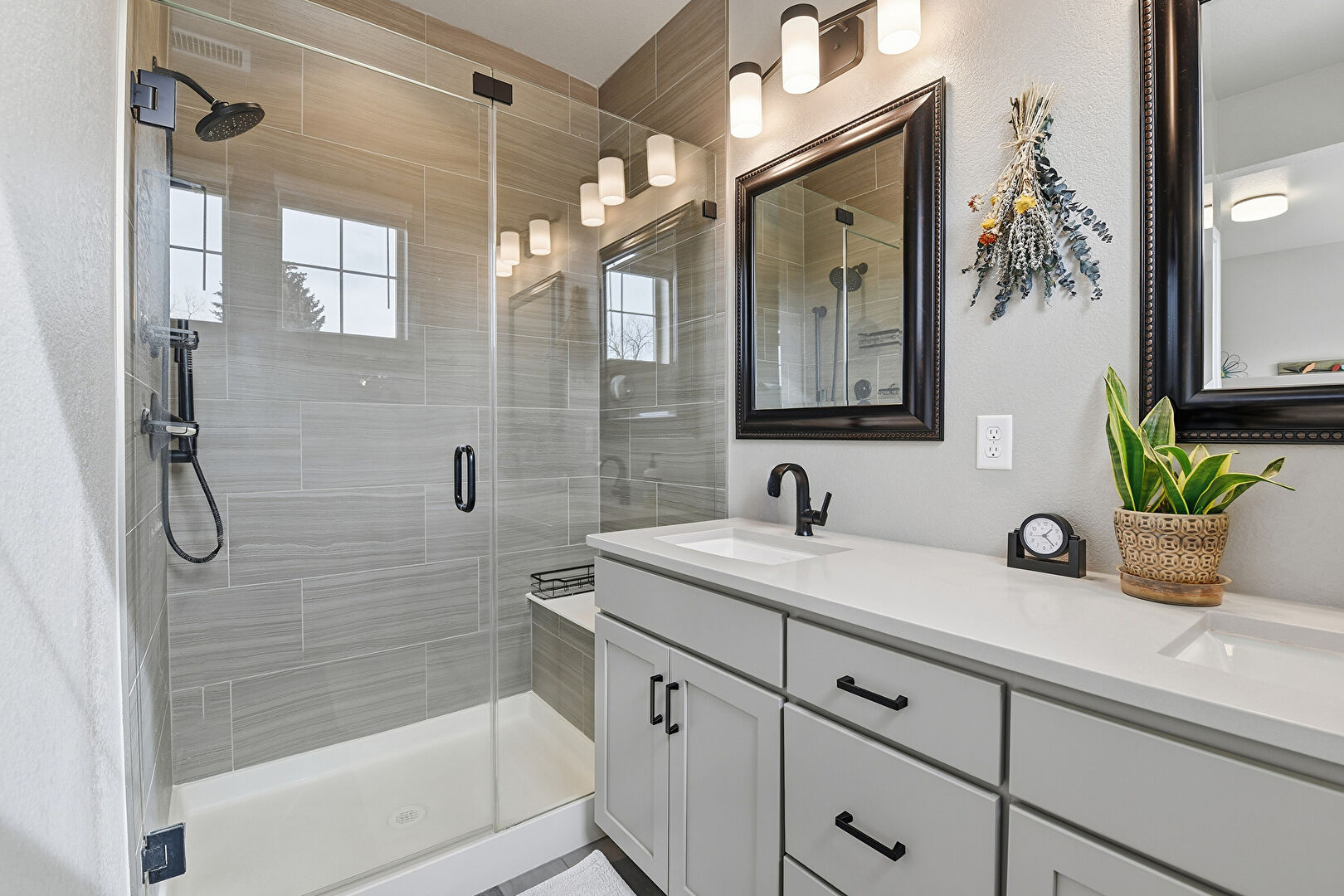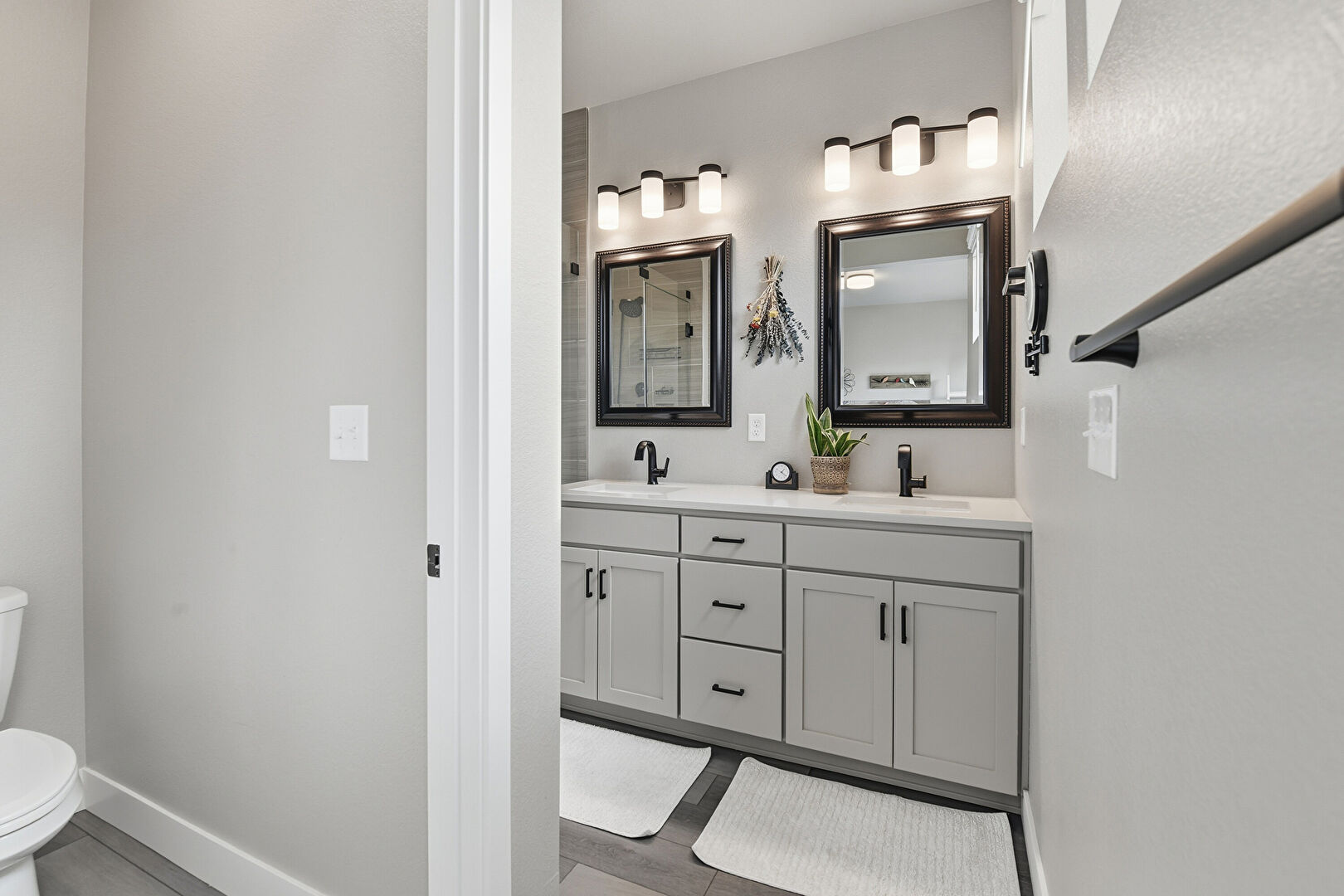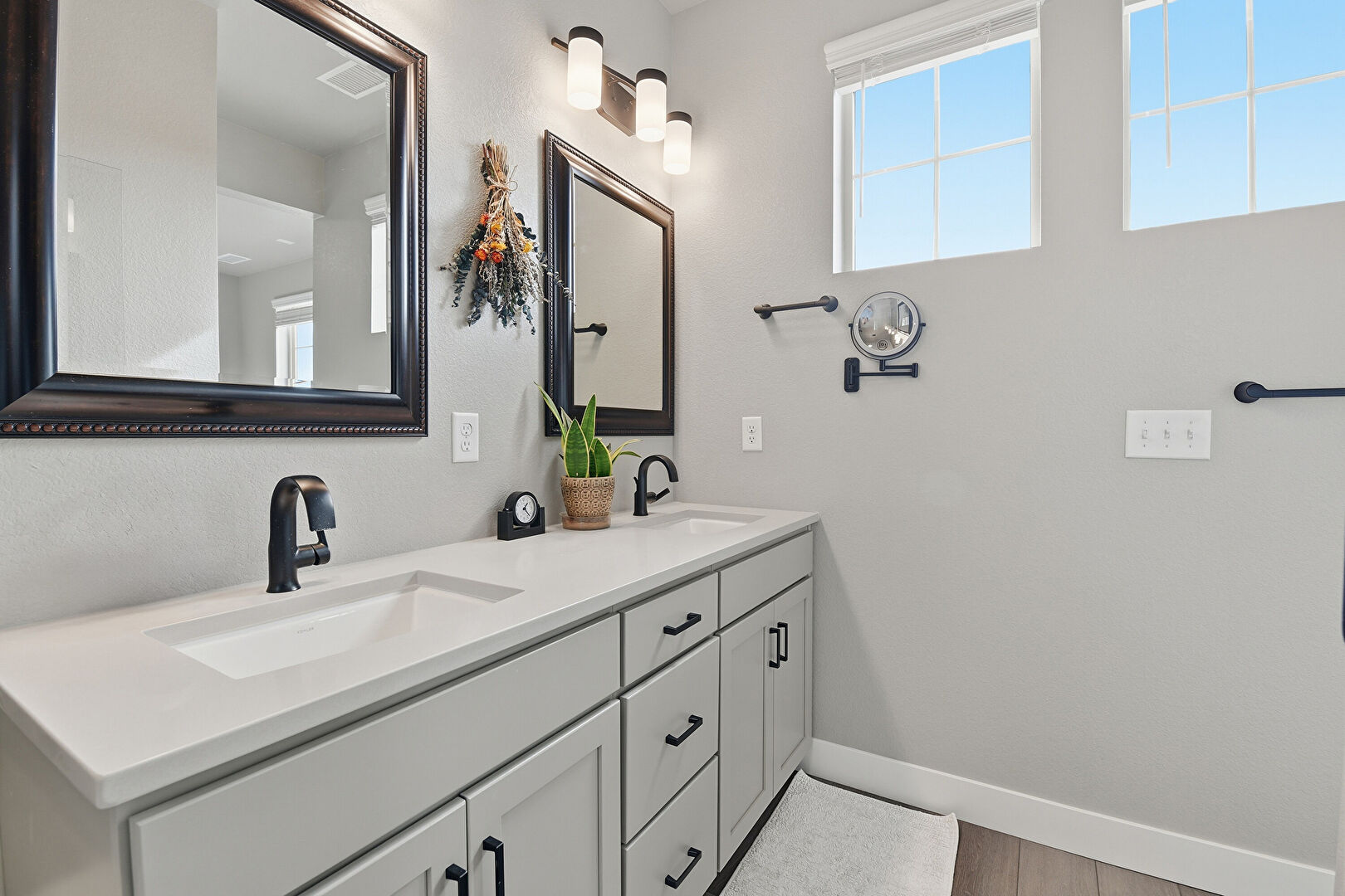 Baseboards Wall, Double Vanity, Drywall, Full Bathroom, Natural Light, Vent, Wood Finish Floor, Baseboards Wall, Vent, Wood Finish Floor