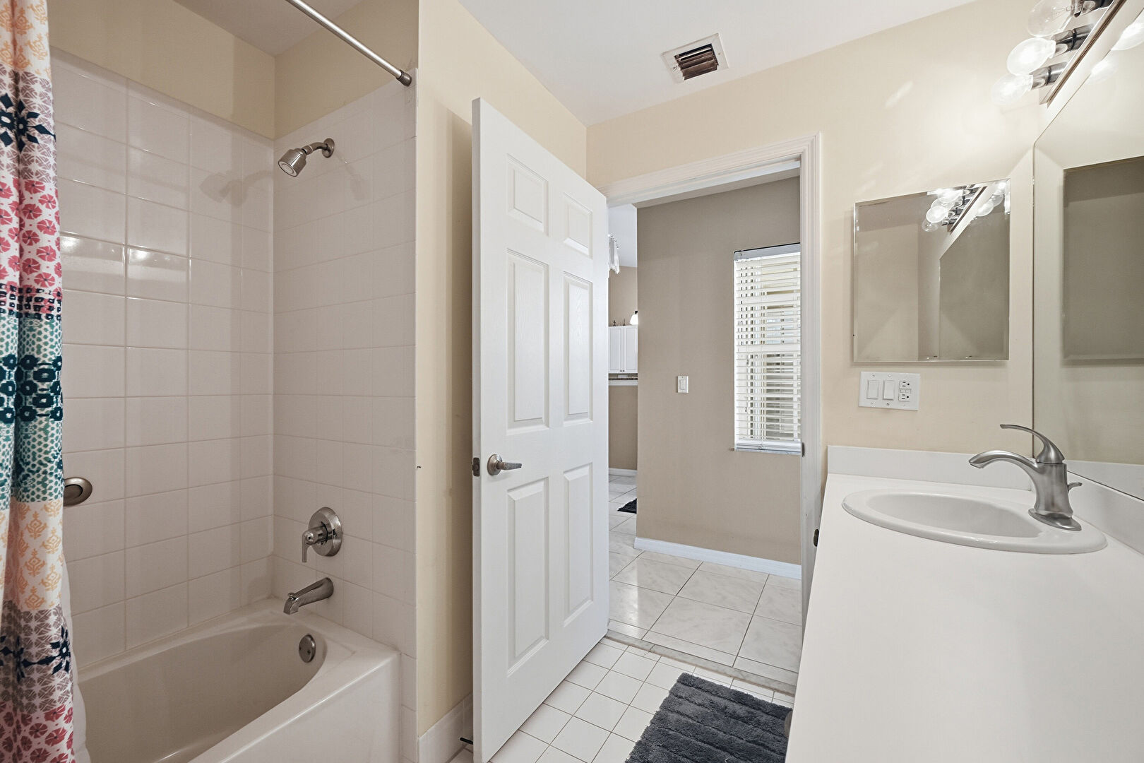Baseboards Wall, Combined Bath Shower, Drywall, Full Bathroom, Natural Light, Tile Floor, Vanity, Vent, Drywall, Vanity