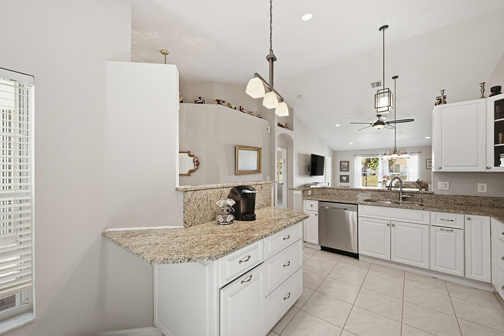 Baseboards Wall, Ceiling Fan, Drywall, High Ceiling, Kitchen Bar, Kitchen Peninsula, Natural Light, Notable Chandelier, Opens To Living Area, Pendant Lighting, Raised Cabinets, Recessed Lighting, Stone Countertops, Tile Floor, Vaulted Ceiling, Vent, Wall Furnace, Glass Insert Cabinets, Recessed Lighting