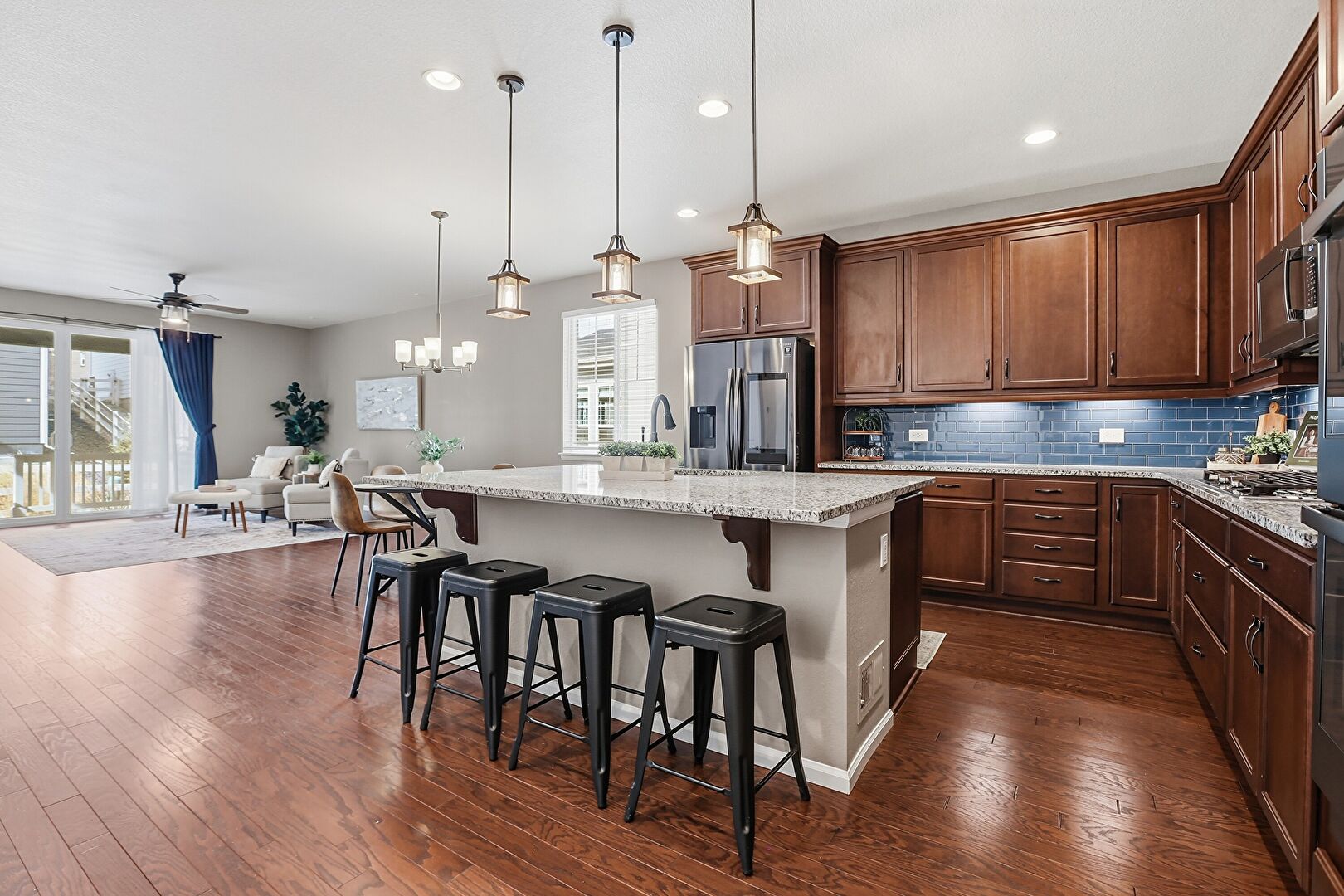 Baseboards Wall, Ceiling Fan, Crown Molding Cabinets, Dark Brown Cabinets, Double Oven, Drywall, Fireplace, Kitchen Bar, Kitchen Island, Medium Brown Cabinets, Natural Light, Notable Chandelier, Opens To Living Area, Pendant Lighting, Recessed Lighting, Shaker Cabinets, Stone Countertops, Wood Finish Floor, Crown Molding Cabinets, Double Oven, L Shaped Kitchen, Notable Chandelier, Shaker Cabinets, Stone Countertops