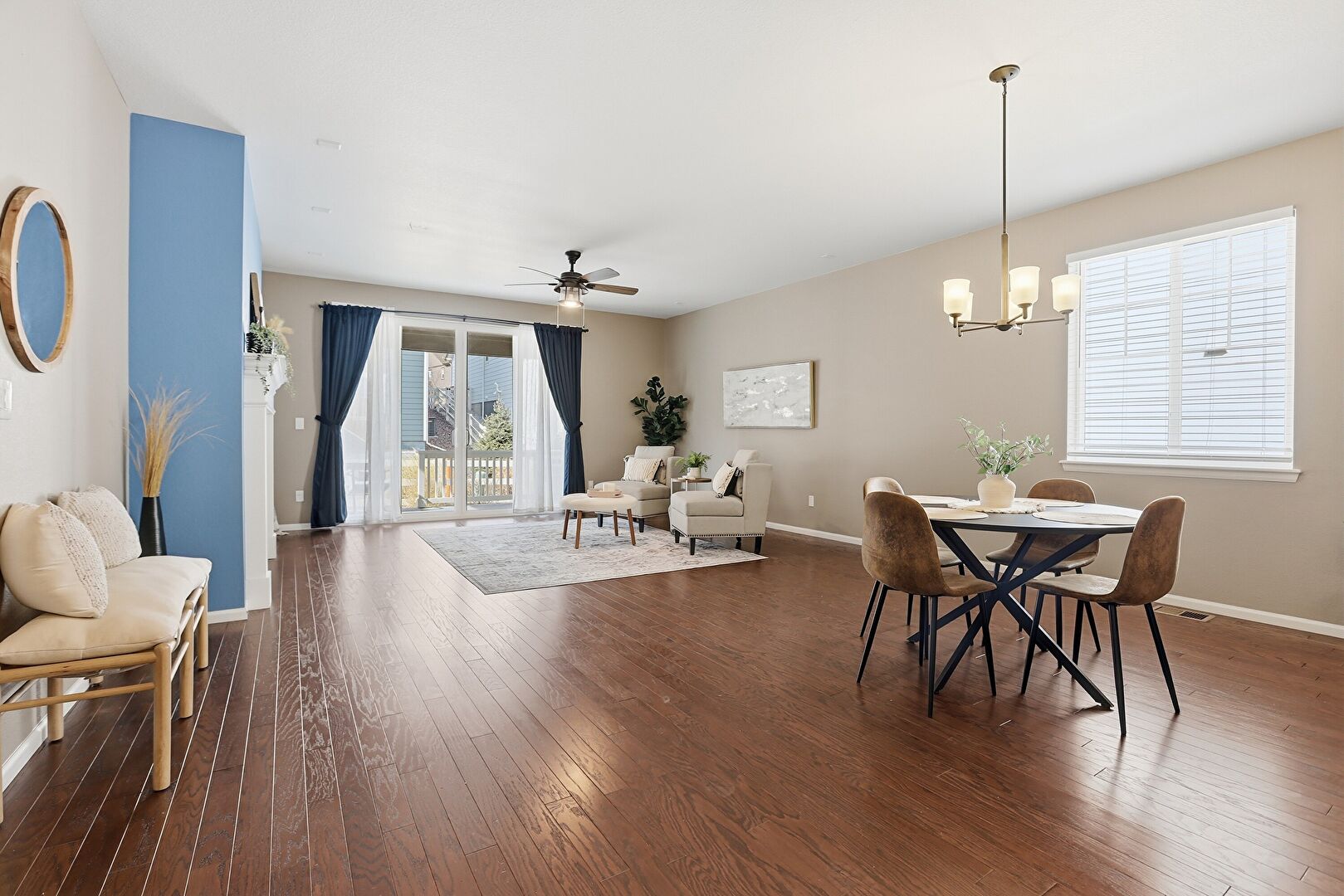 Baseboards Wall, Ceiling Fan, Drywall, Natural Light, Vent, Wood Finish Floor, Notable Chandelier