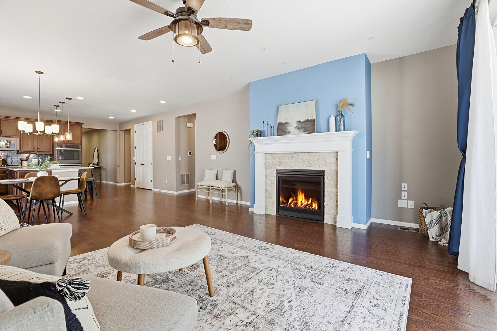 Baseboards Wall, Ceiling Fan, Double Oven, Drywall, Fireplace, L Shaped Kitchen, Natural Light, Notable Chandelier, Recessed Lighting, Vent, Wood Finish Floor, Baseboards Wall, Fireplace, Natural Light, Wood Finish Floor
