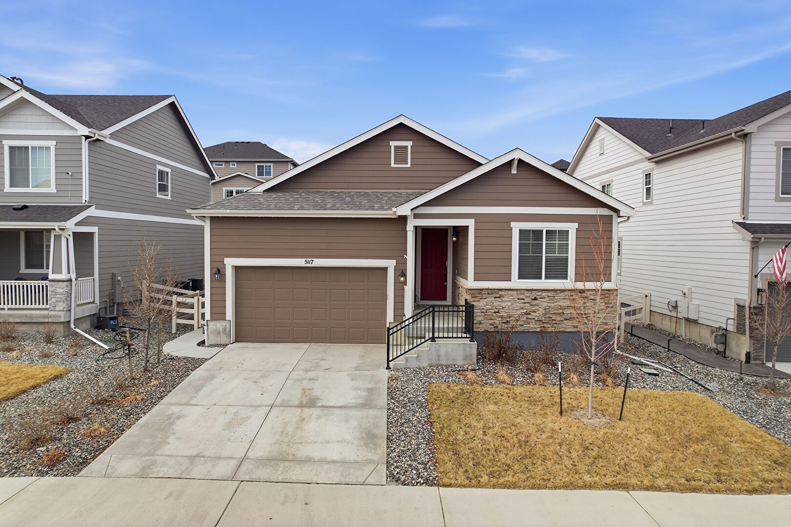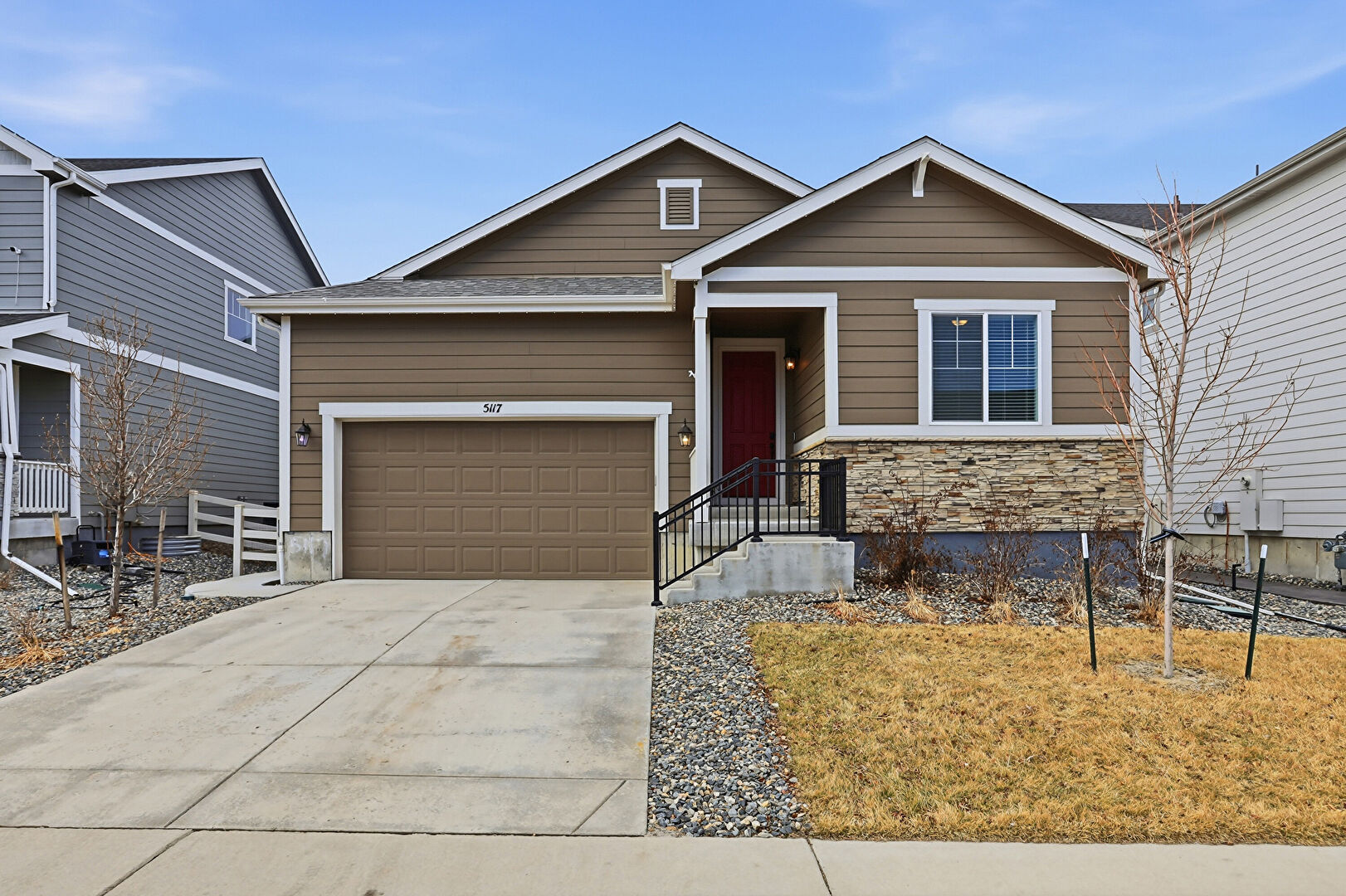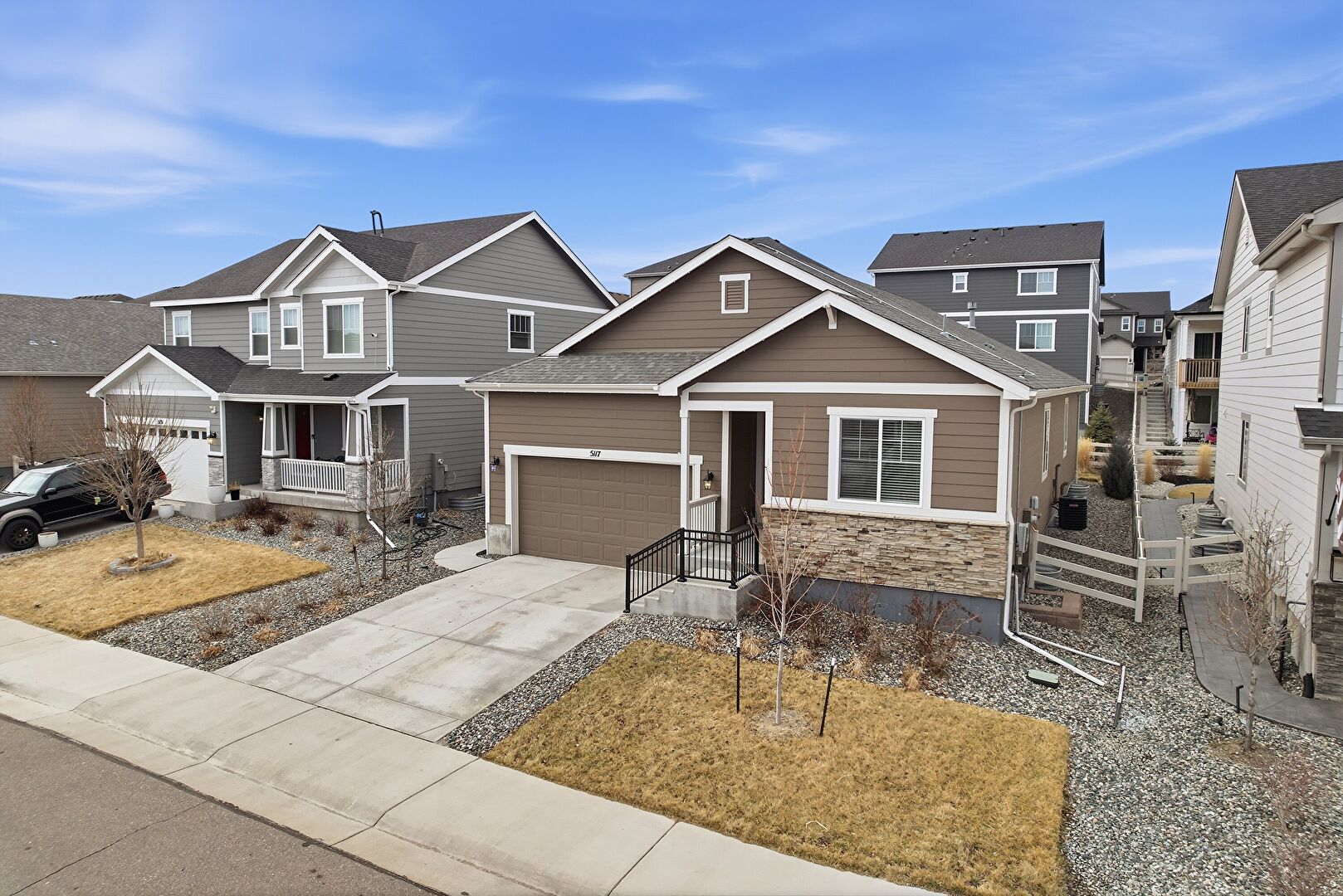 Concrete Foundation, Downspout, Driveway, Gutters, Horizontal Siding, Porch, Stone Siding, Built In Garage, Horizontal Siding