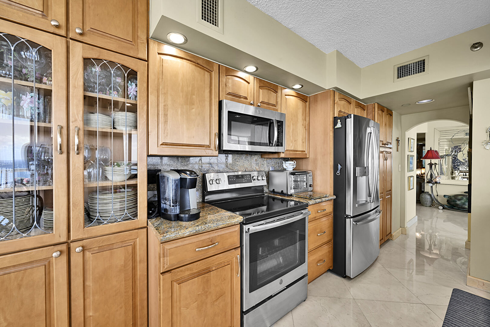 Arched Cabinets, Arched Walkways, Drywall, Floor Ceiling Windows, Galley Kitchen, Glass Insert Cabinets, Kitchen Bar, Kitchen Peninsula, Medium Brown Cabinets, Natural Light, Notable Chandelier, Pendant Lighting, Raised Cabinets, Recessed Lighting, Stone Countertops, Textured Ceiling, Tile Floor, Toaster, U Shaped Kitchen, Vent, Water View, Medium Brown Cabinets, Notable Chandelier, Recessed Lighting, Stone Countertops, Toaster