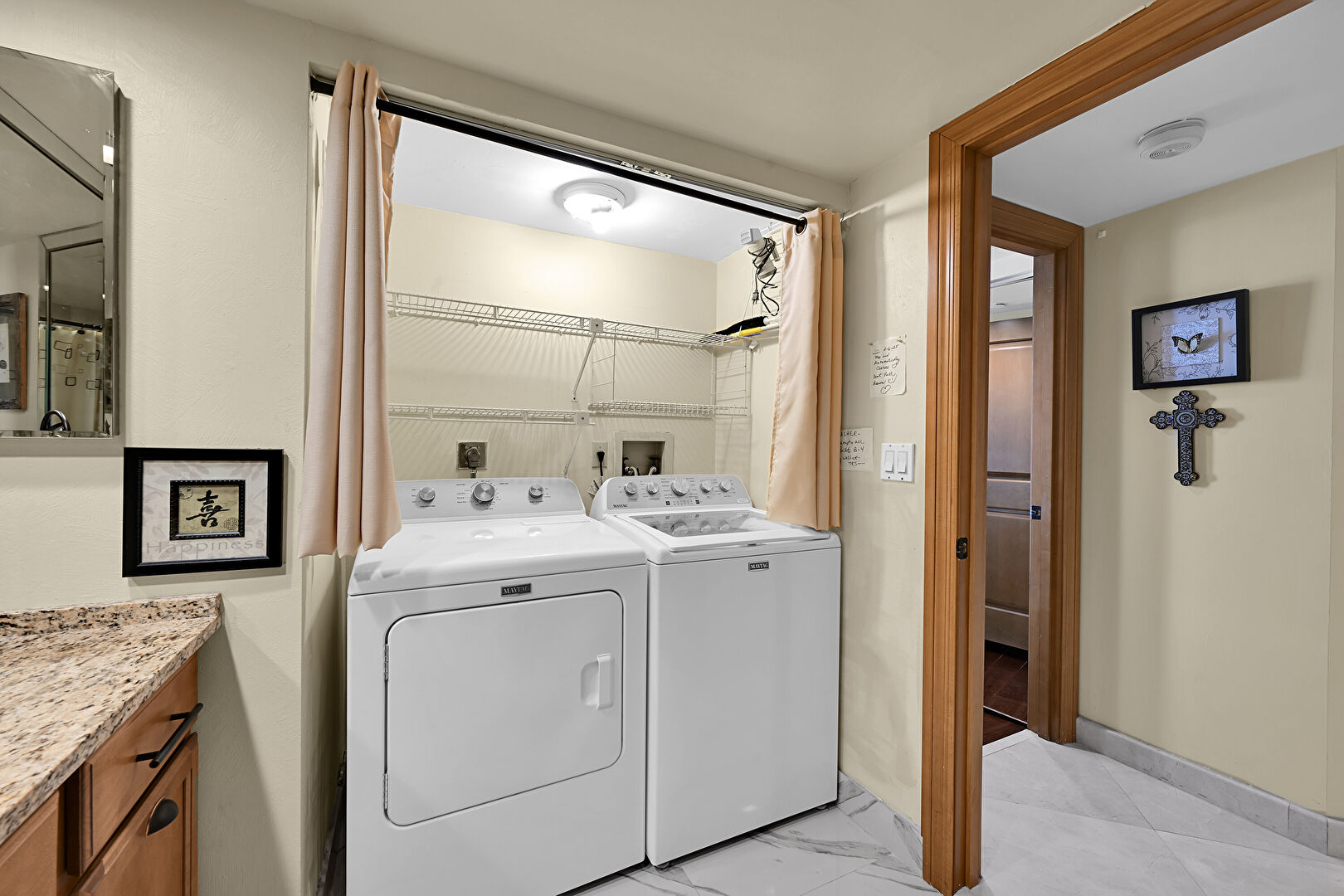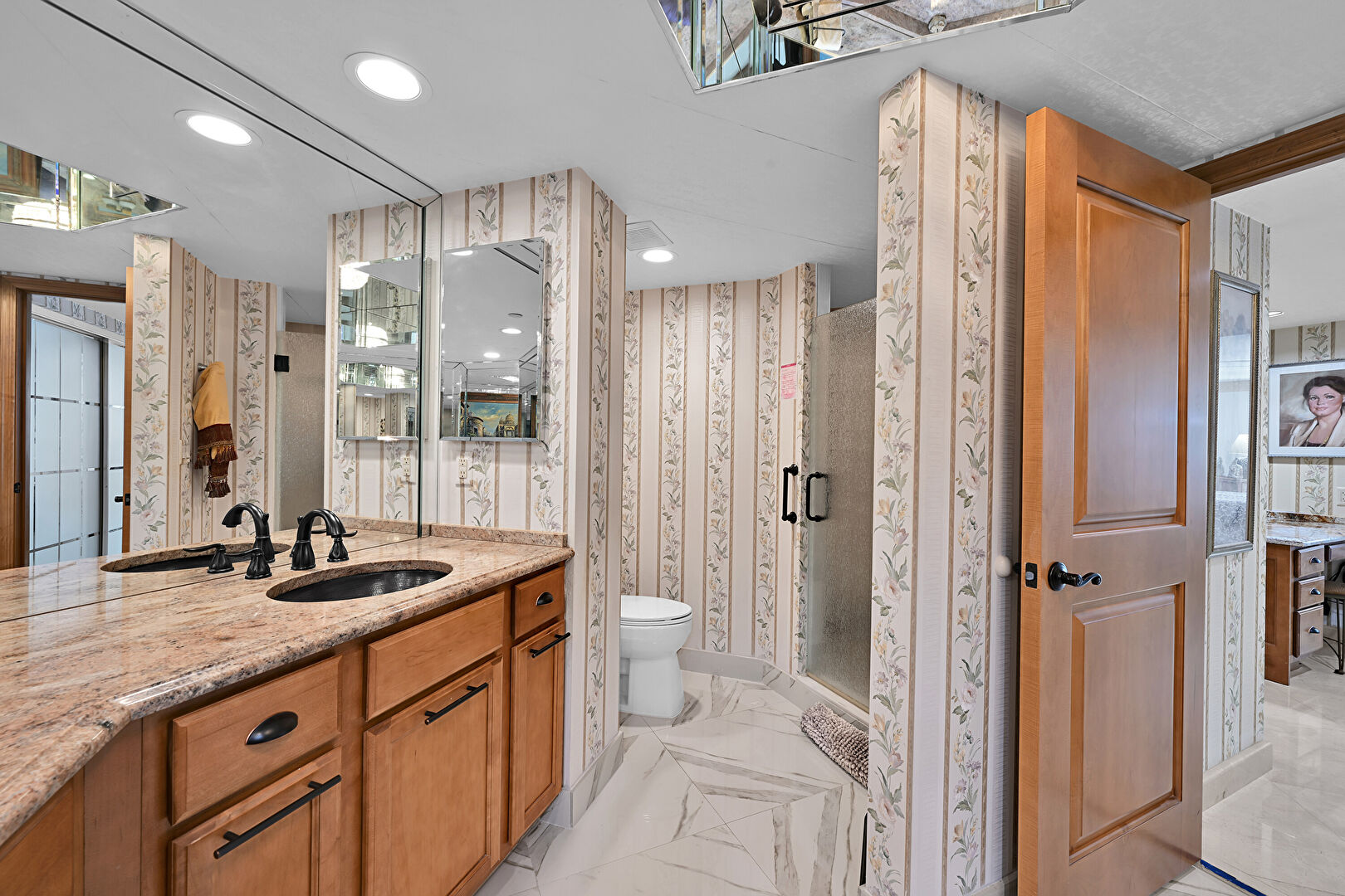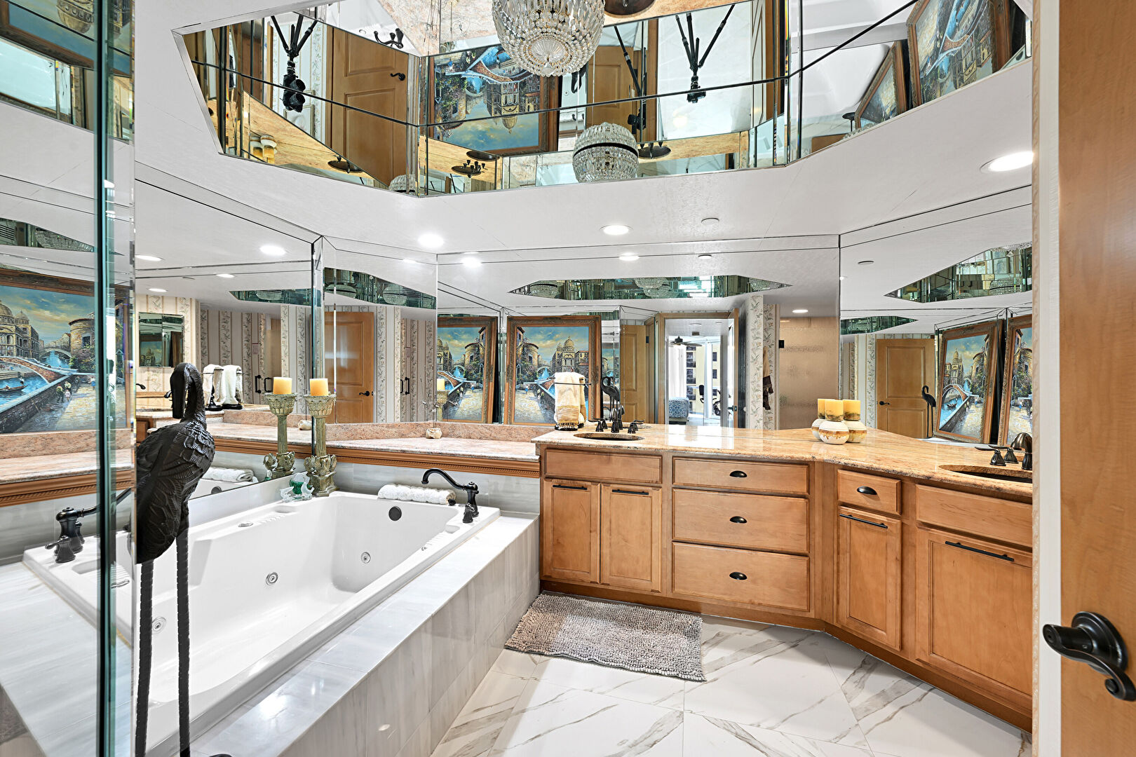 Baseboards Wall, Ceiling Fan, Double Vanity, Drywall, Ensuite Bathroom, Full Bathroom, High Ceiling, Laundry, Marble Finish Floor, Natural Light, Recessed Lighting, Smoke Carbon Monoxide Detector, Textured Ceiling, Tile Floor, Vanity, Vent, Wallpaper Wall, Washer Hookup, Baseboards Wall, Full Bathroom, Recessed Lighting, Vanity
