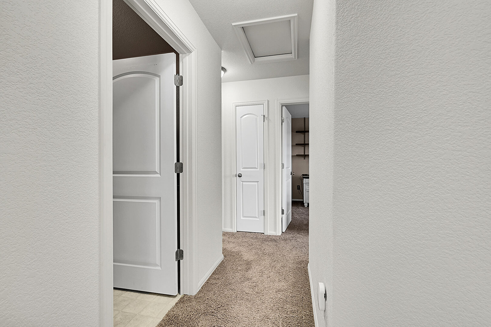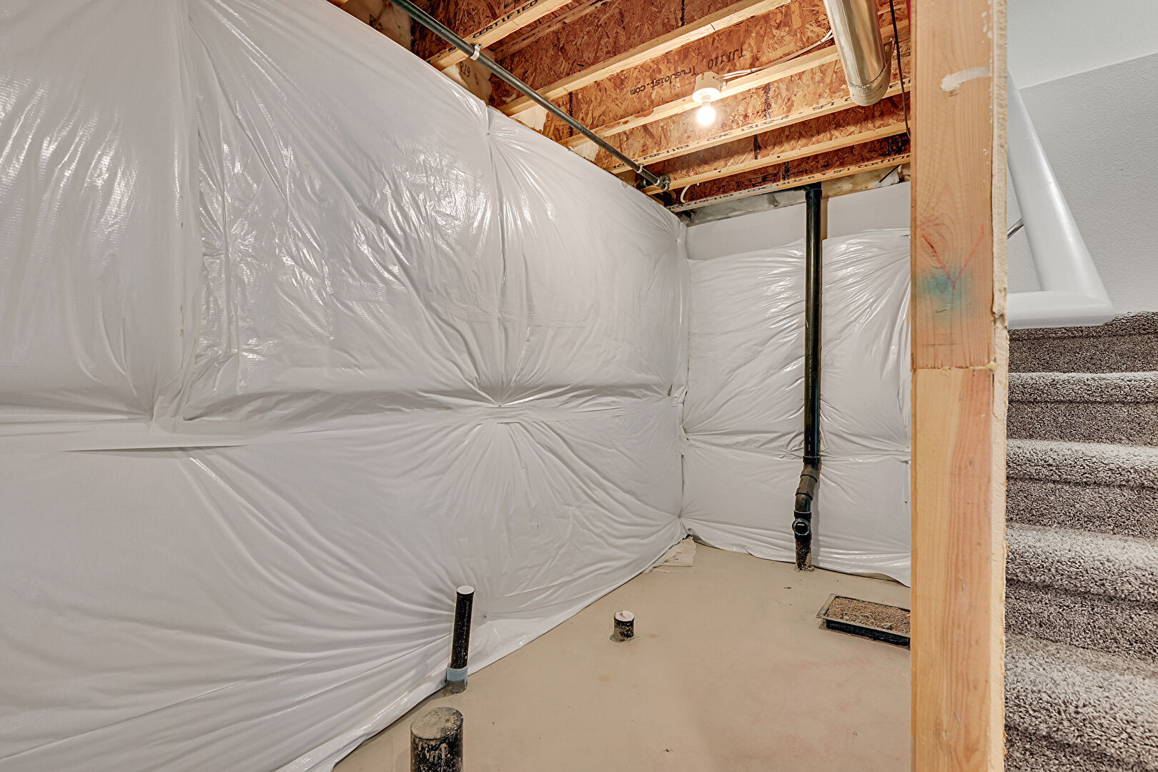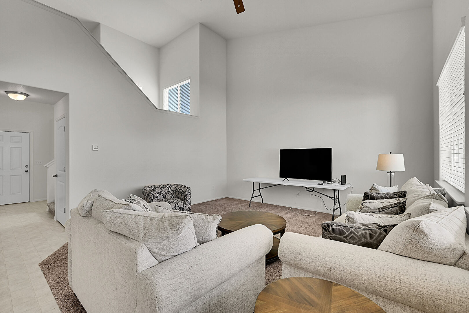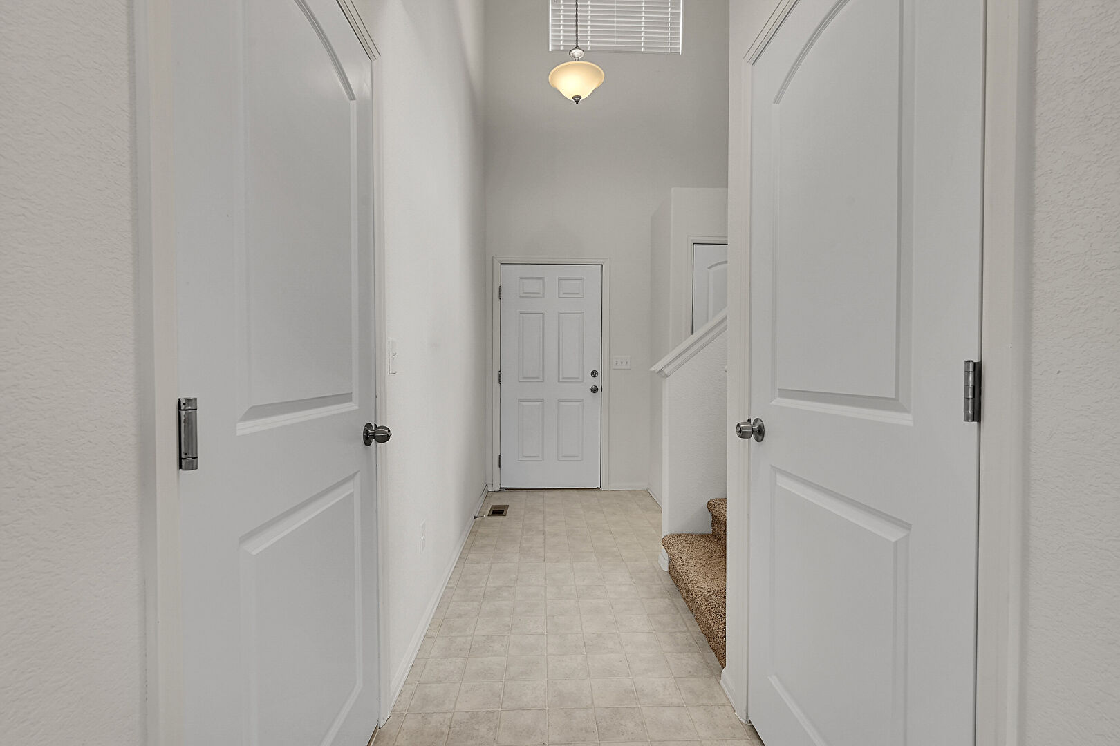Baseboards Wall, High Ceiling, Scuttle, Stairs, Textured Wall, Vent, Vinyl Floor, Carpet, Textured Wall