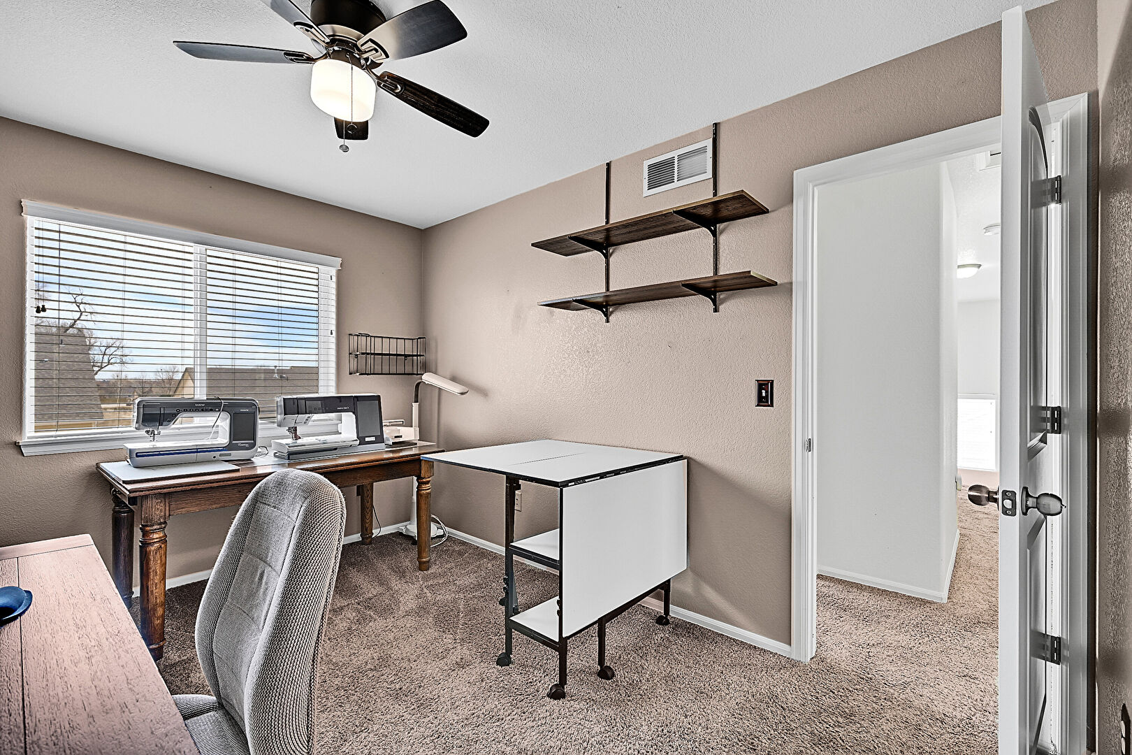 Baseboards Wall, Carpet, Ceiling Fan, Drywall, Natural Light, Office Area, Textured Wall, Vent, Natural Light, Office Area