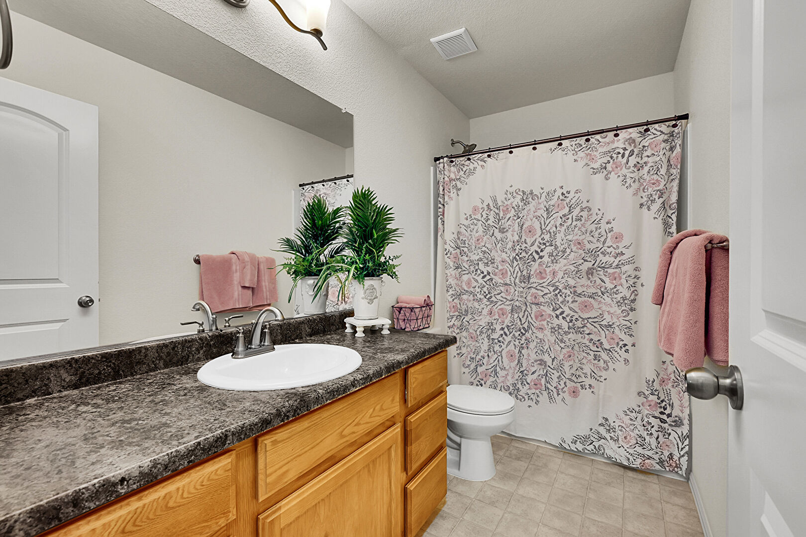 Combined Bath Shower, Drywall, Full Bathroom, Vent, Vinyl Floor, Vanity