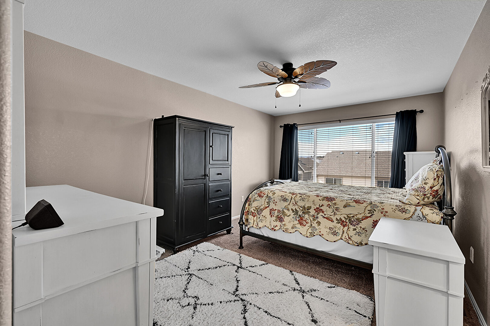 Baseboards Wall, Ceiling Fan, Drywall, Natural Light, Textured Wall, Carpet