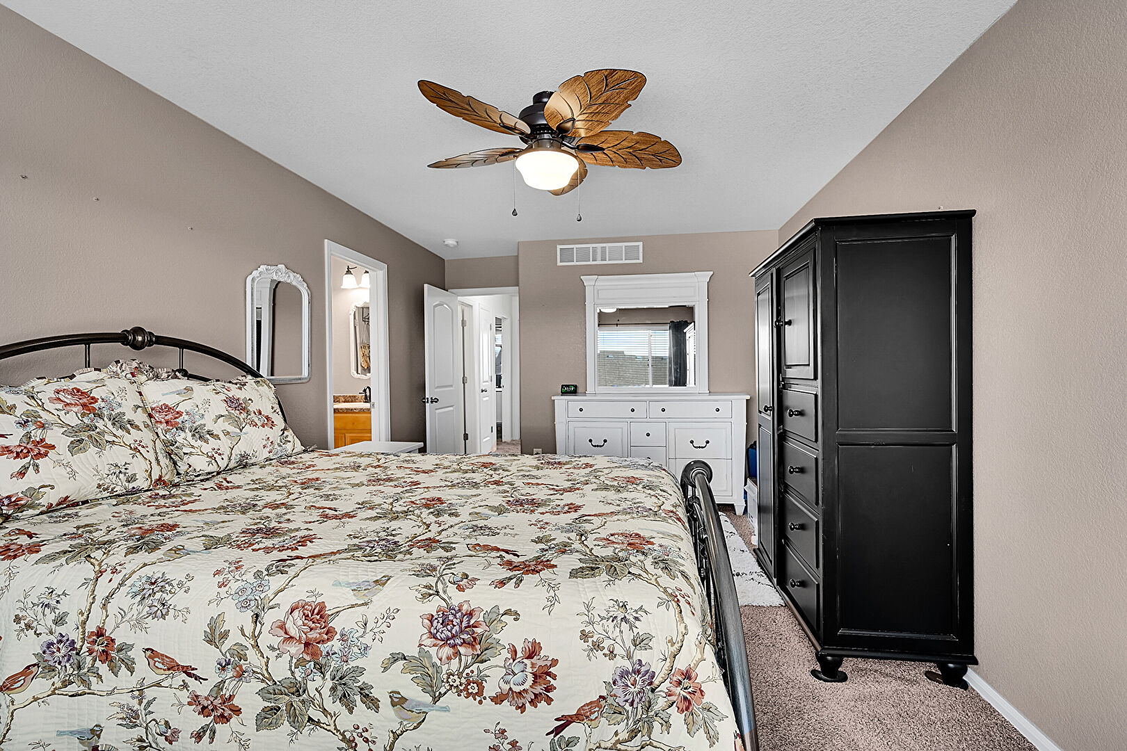 Baseboards Wall, Carpet, Ceiling Fan, Drywall, Ensuite Bathroom, Natural Light, Textured Ceiling, Textured Wall, Vent, Vinyl Floor, Baseboards Wall, Carpet, Ceiling Fan