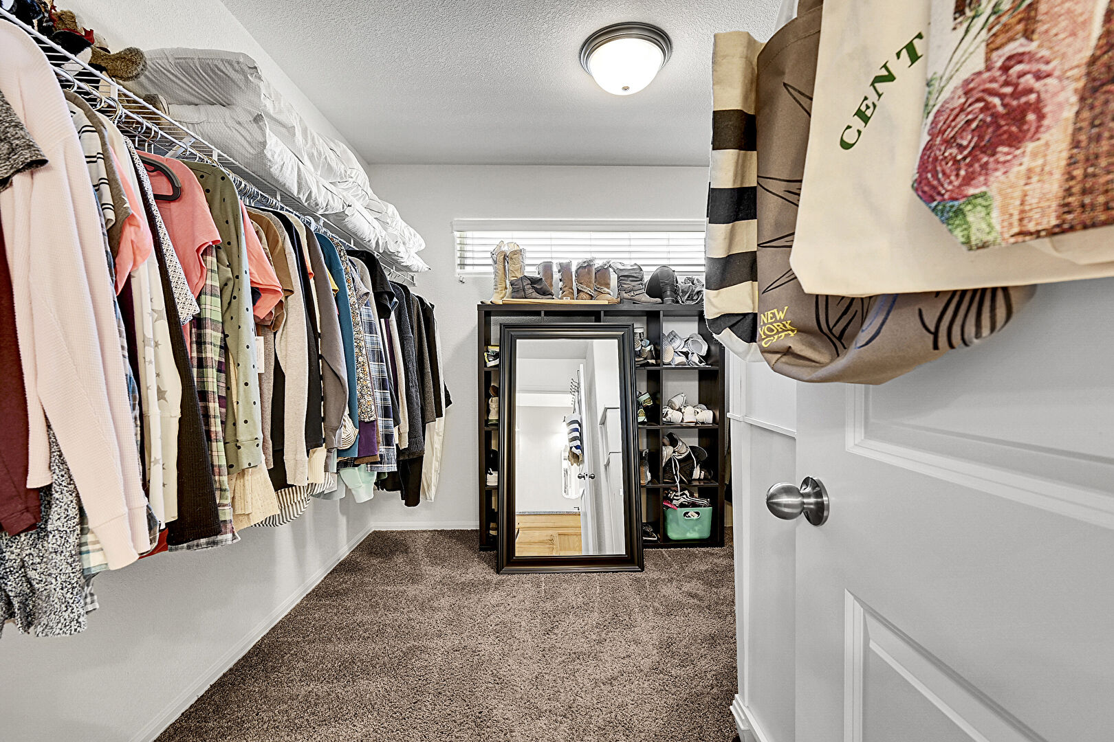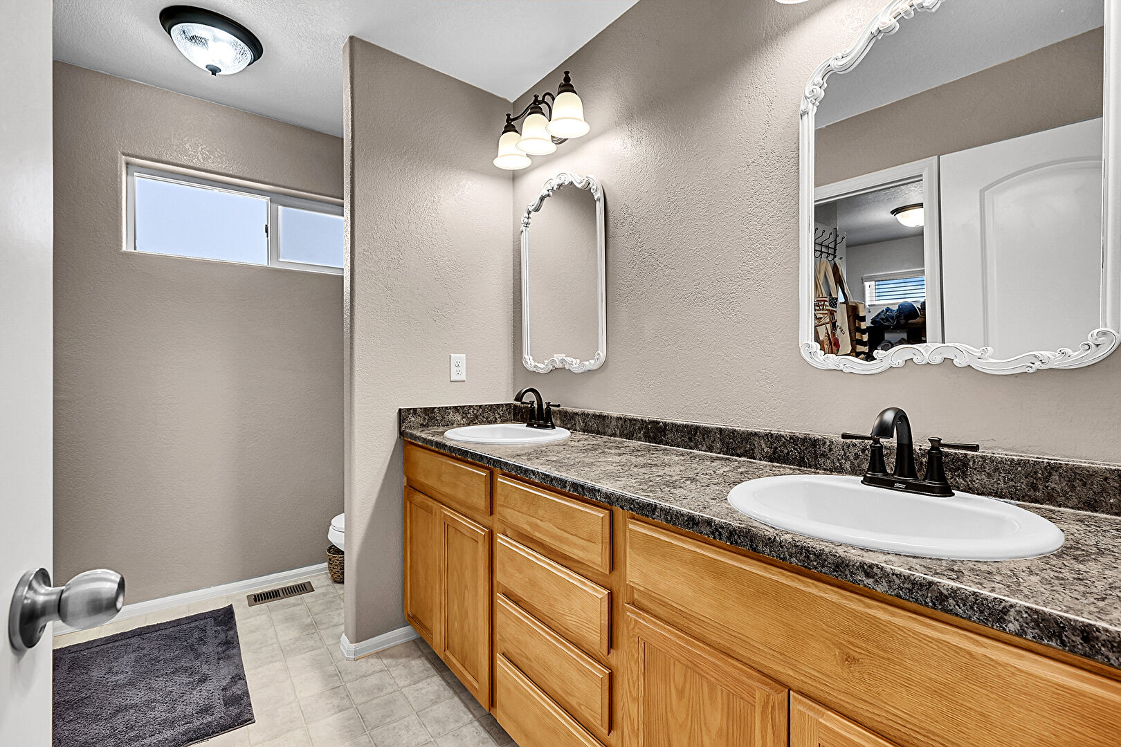 Baseboards Wall, Carpet, Double Vanity, Full Bathroom, Natural Light, Textured Wall, Vent, Vinyl Floor, Vinyl Floor, Walk In Closet