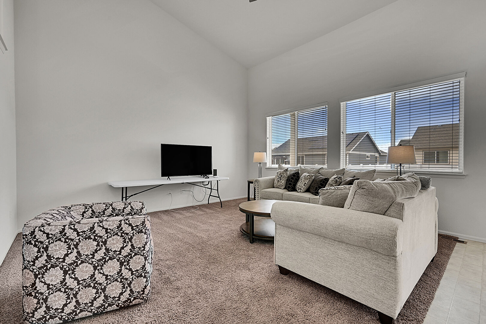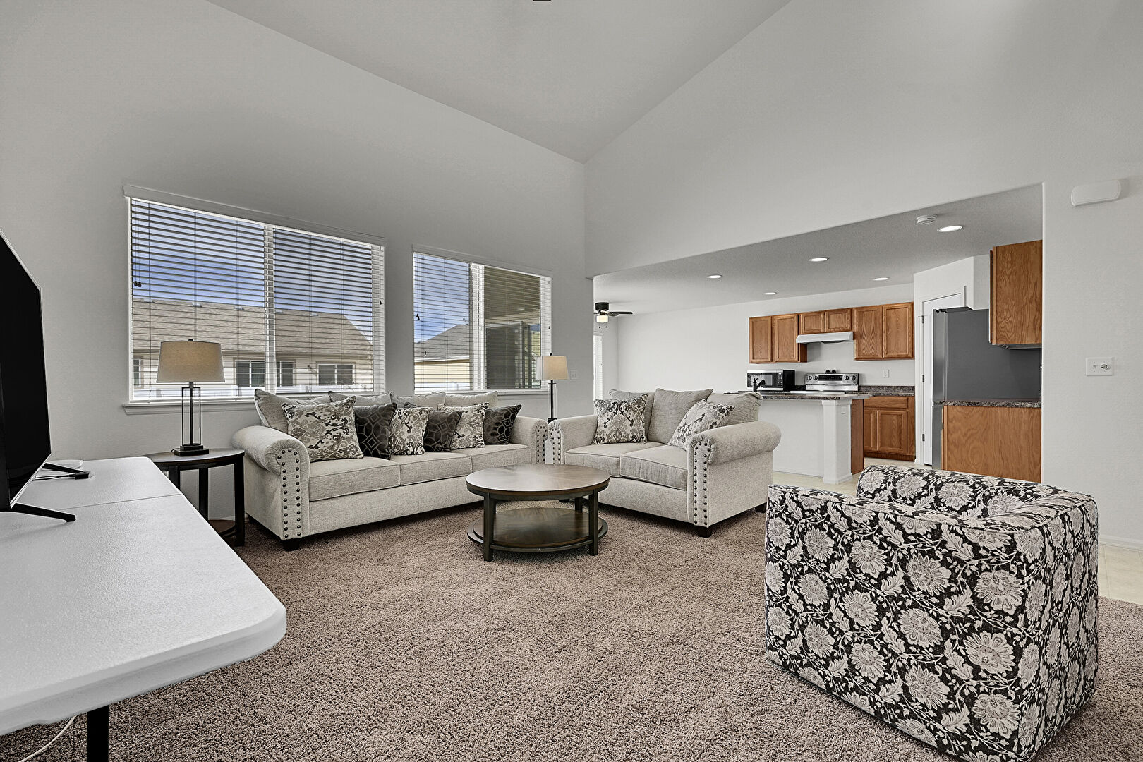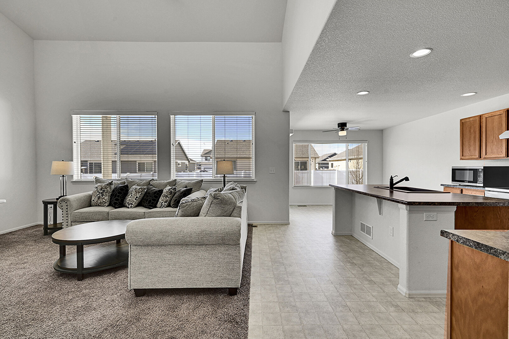 Baseboards Wall, Carpet, Ceiling Fan, Drywall, High Ceiling, Natural Light, Recessed Lighting, Textured Ceiling, Vaulted Ceiling, Vent, Vinyl Floor, Ceiling Fan, High Ceiling, L Shaped Kitchen, Vaulted Ceiling