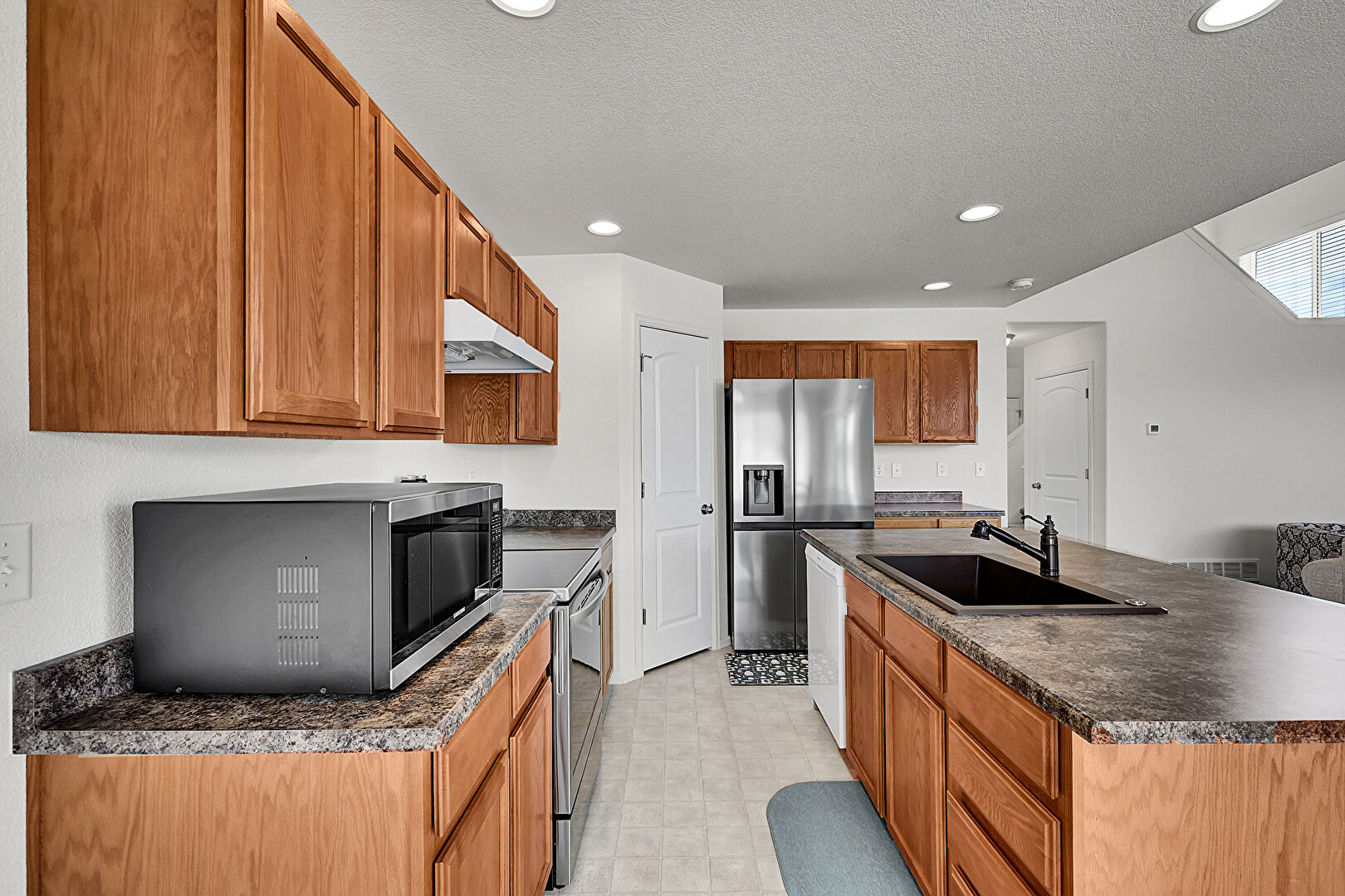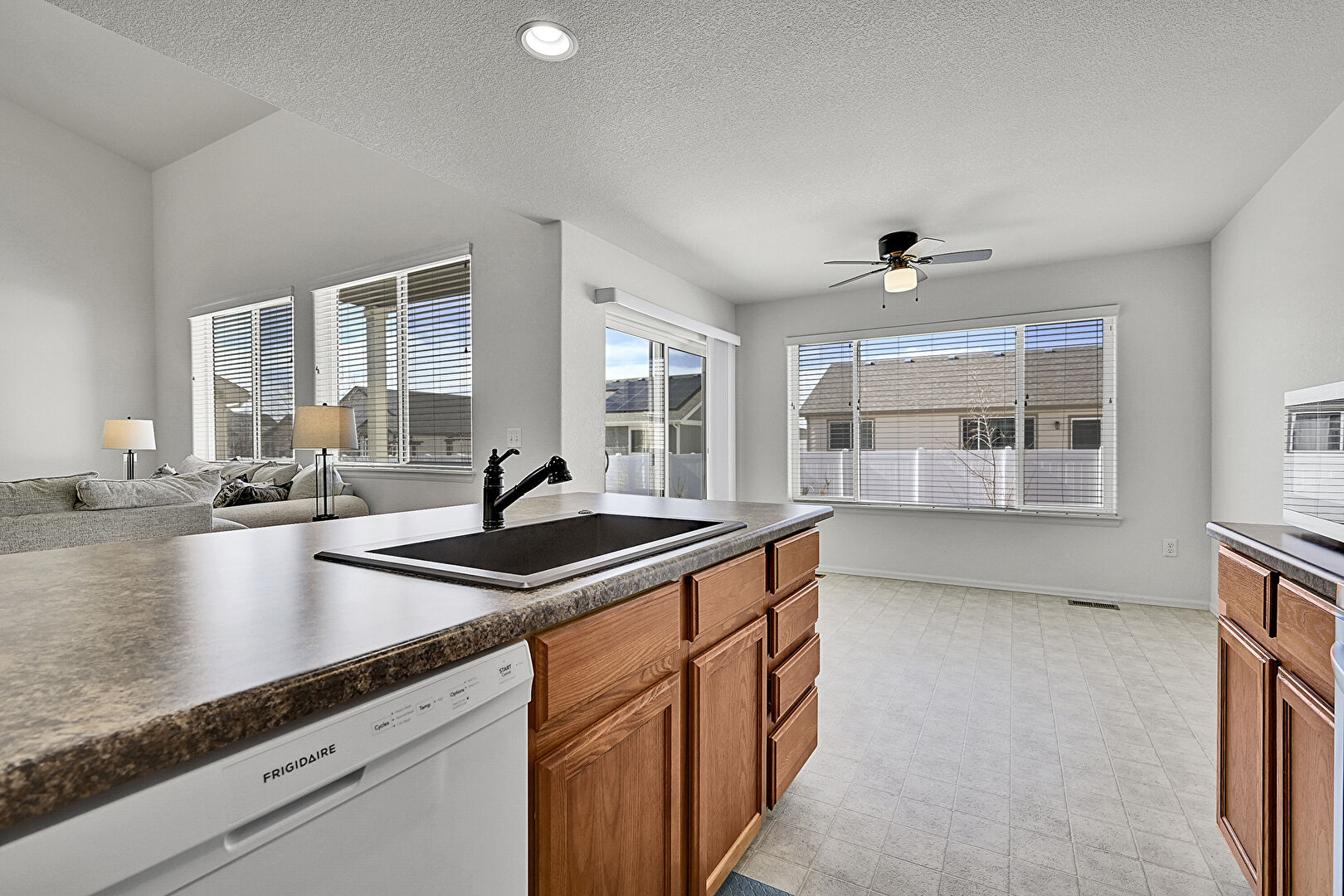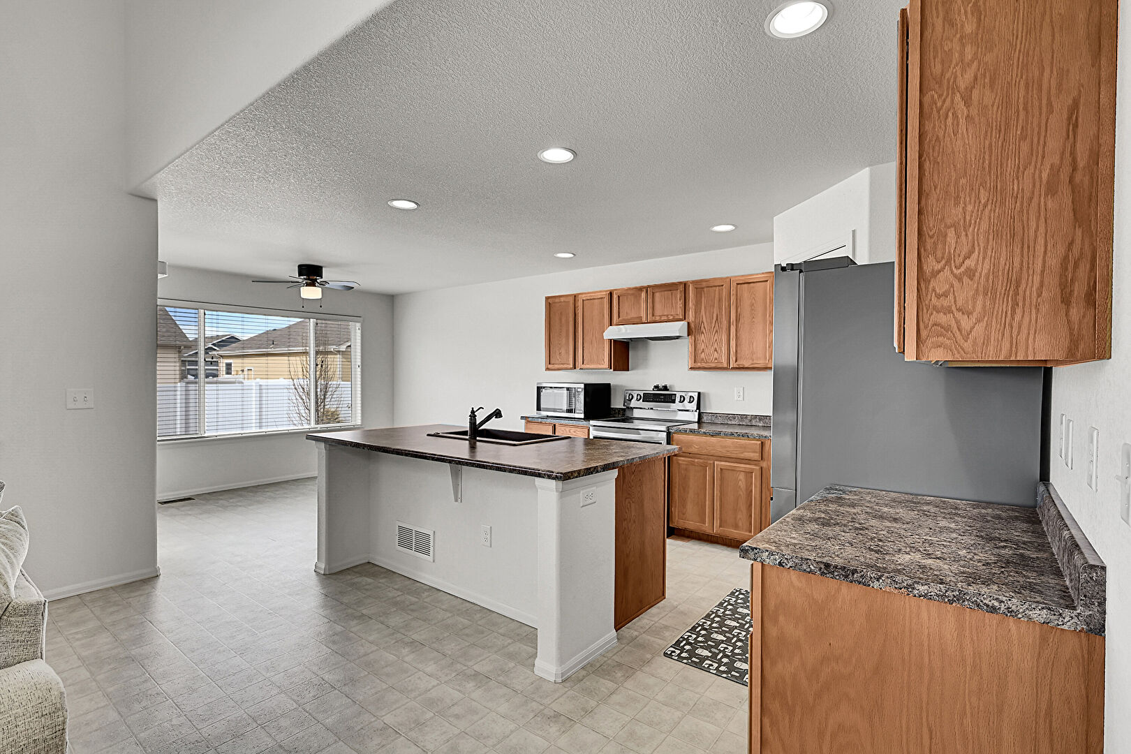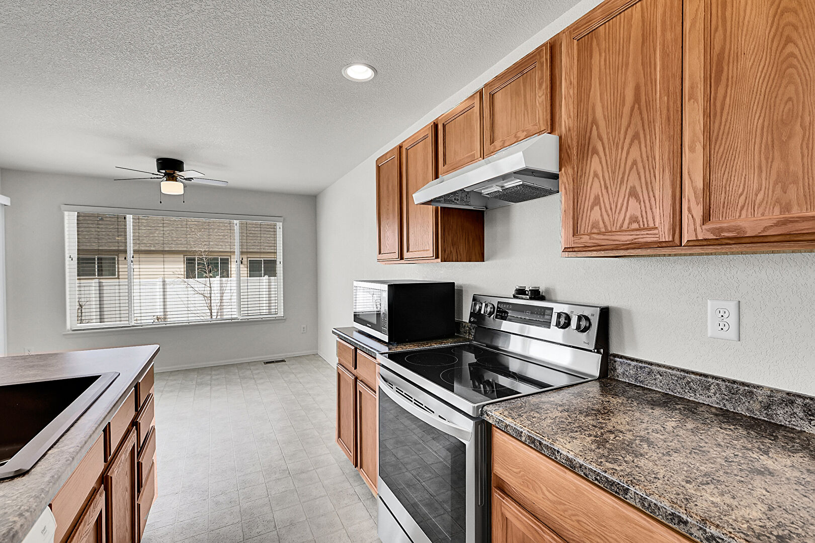 Baseboards Wall, Ceiling Fan, Drywall, Medium Brown Cabinets, Natural Light, Recessed Lighting, Shaker Cabinets, Stone Countertops, Textured Ceiling, Textured Wall, Vent, Baseboards Wall, Vinyl Floor
