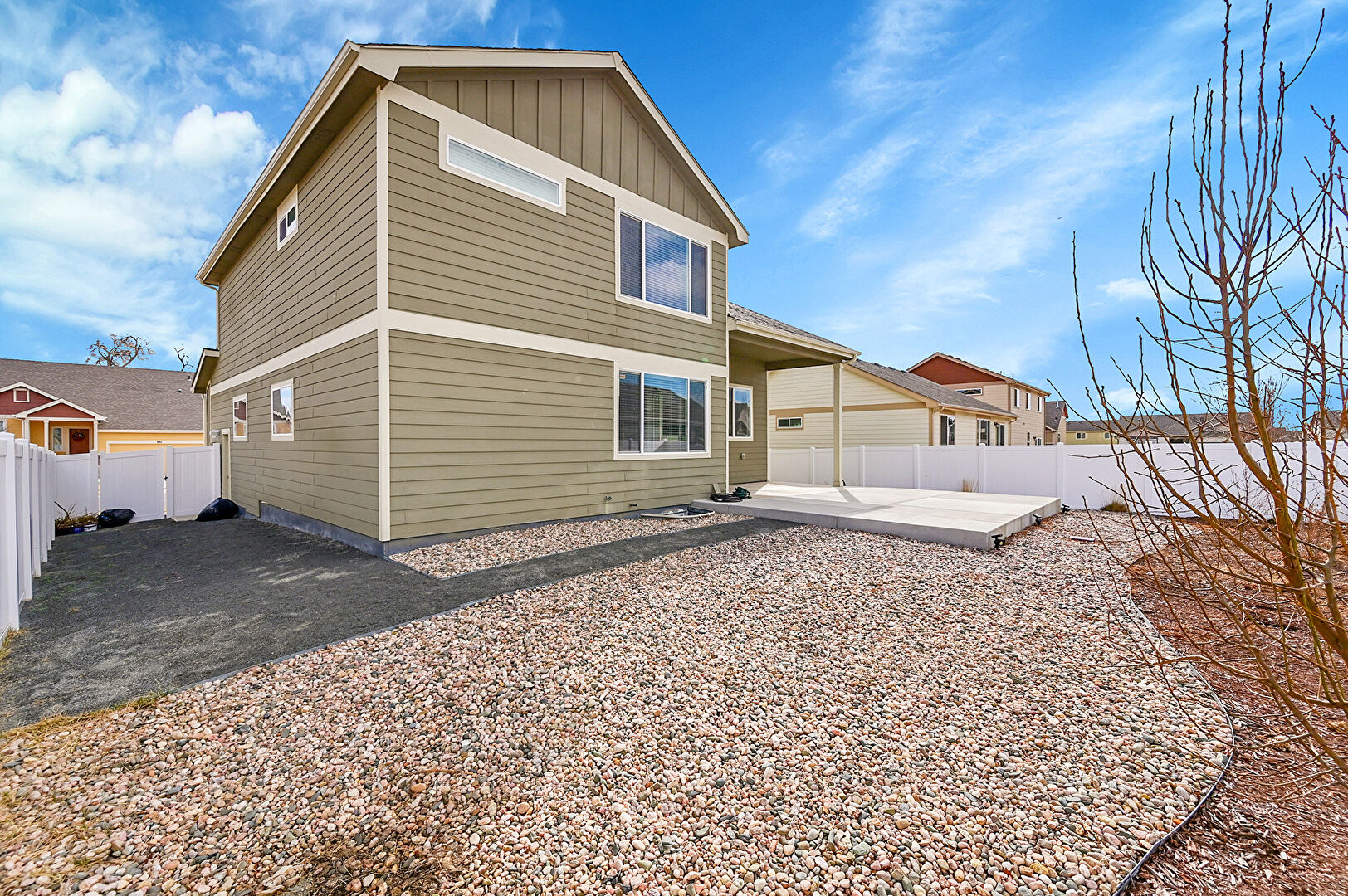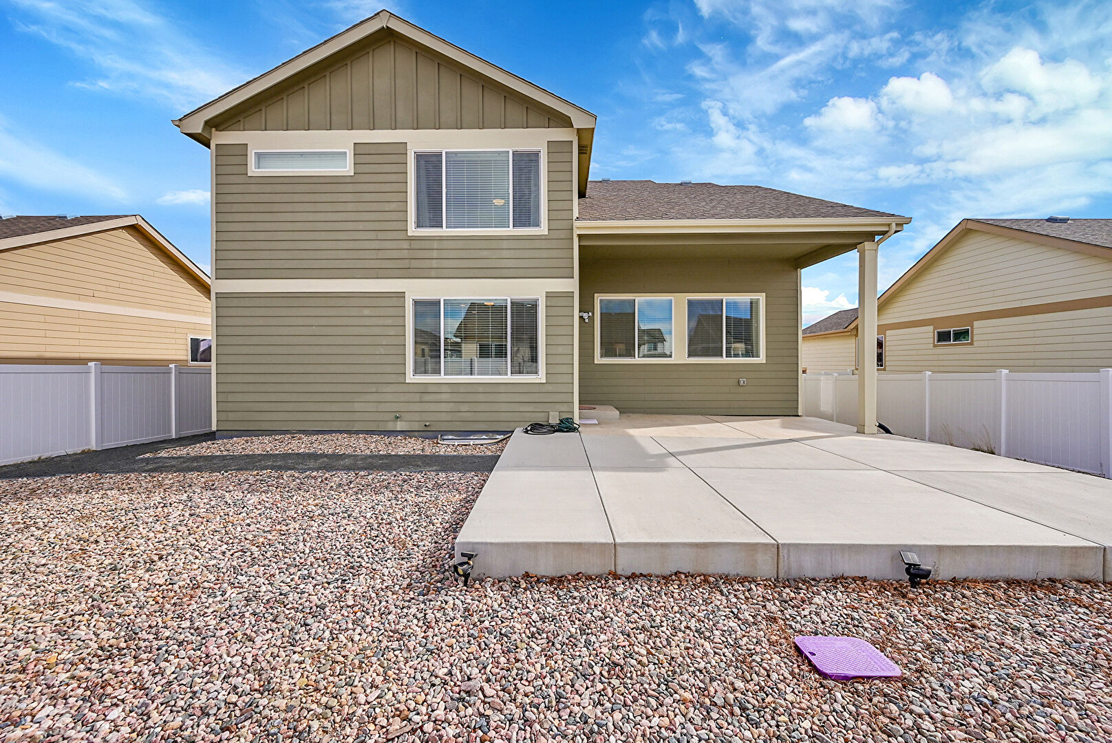 Board Batten Siding, Concrete Foundation, Downspout, Fence, Gutters, Horizontal Siding, Patio, Shingle Roof, Vertical Siding, Water Meter, Fence, Gate, Shingle Roof