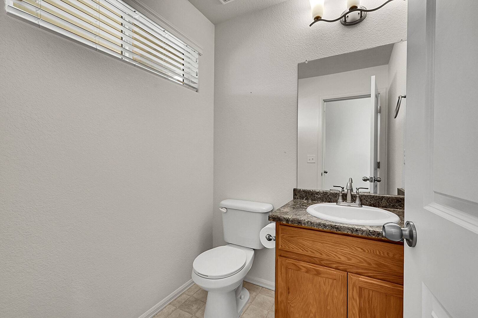 Baseboards Wall, Natural Light, Notable Chandelier, Textured Wall, Tile Floor, Vanity, Half Bathroom
