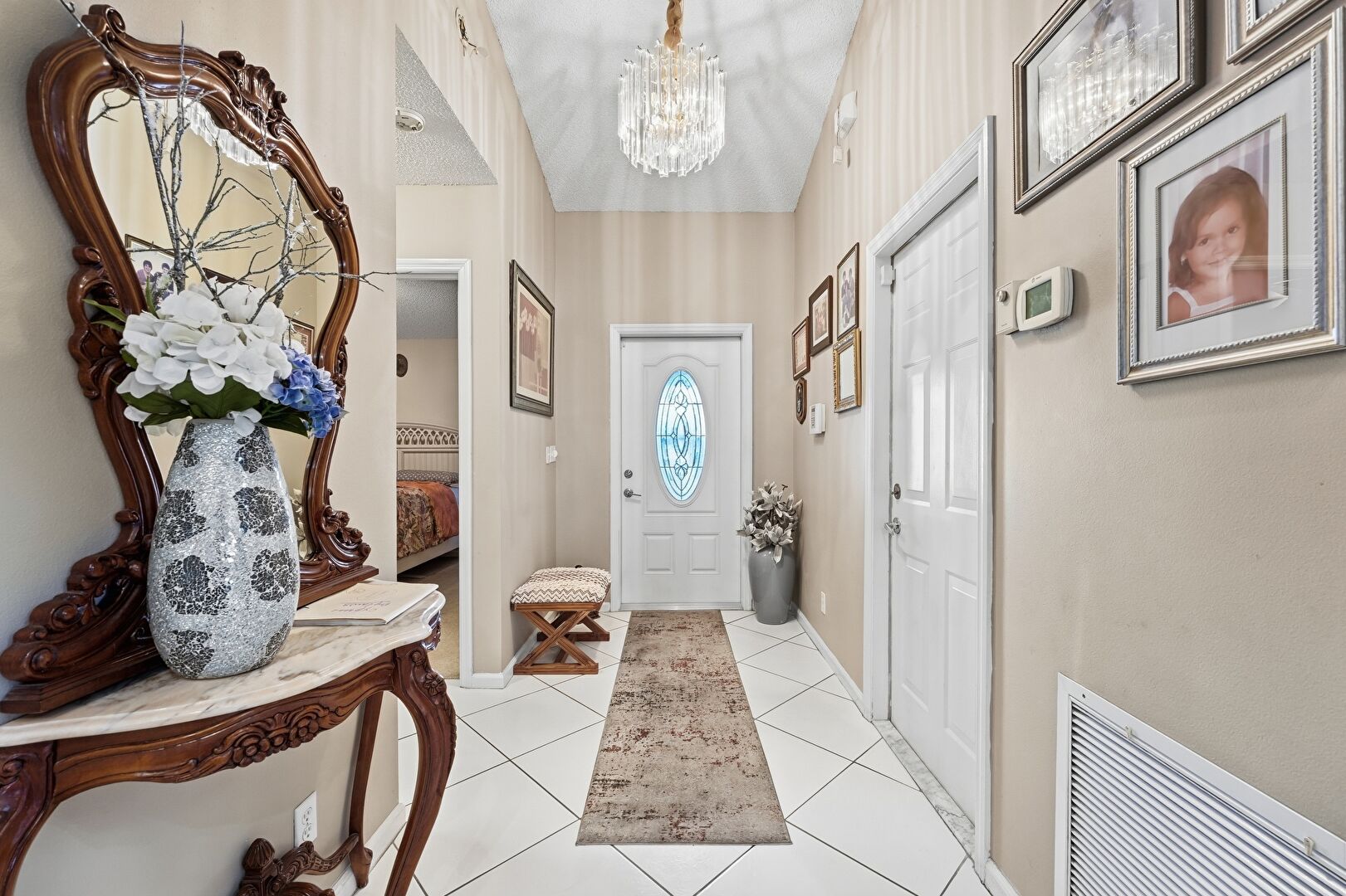 Baseboards Wall, Ceiling Fan, Drywall, High Ceiling, Natural Light, Recessed Lighting, Tile Floor, Vaulted Ceiling, Vent, Notable Chandelier, Recessed Lighting
